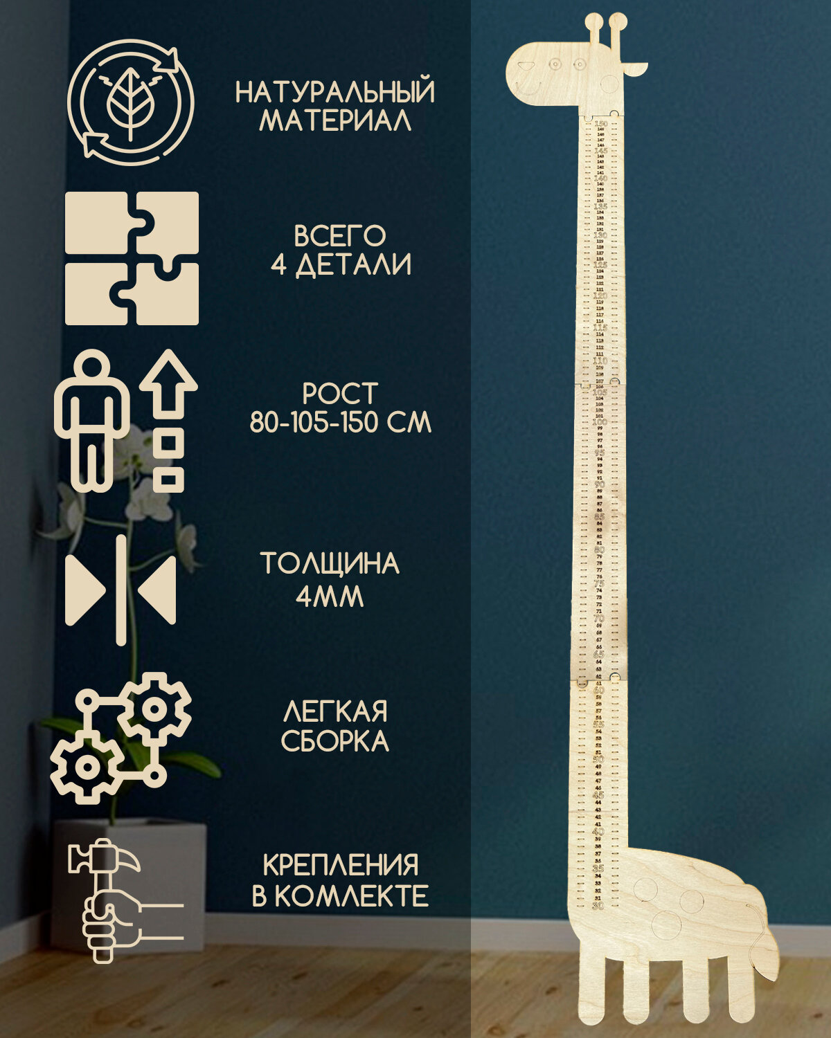 Ростомер "Жираф", дерево, самоклеящийся, место для фото, растущий, раскраска информация: