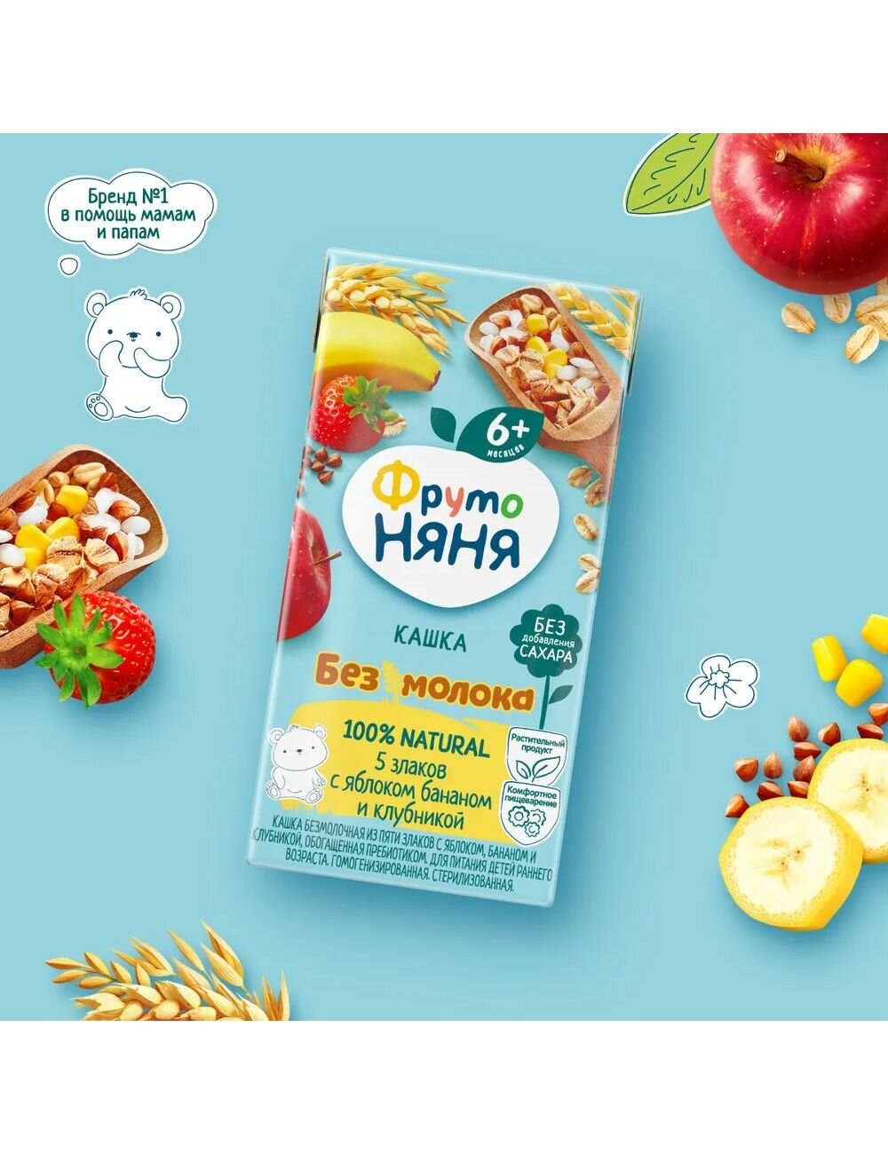 10 цен на Кашка безмолочная ФрутоНяня 5злаков яблоко, банан, клубника, с 6месяцев 0.2л 2шт