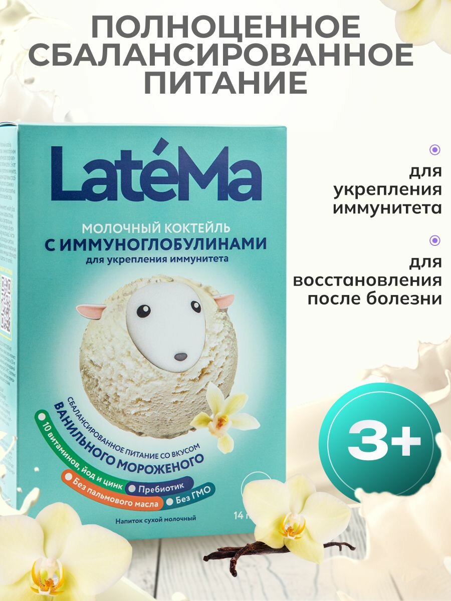 LateMa (Латема) Детская смесь молочная для приготовления молочного коктейля с иммуноглобулинами ванильное мороженое информация: