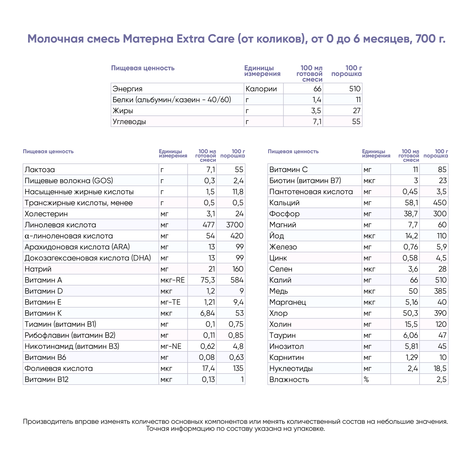 Materna Молочная смесь Матерна Extra Care (от коликов), от 0 до 6 месяцев, 700 г. информация: