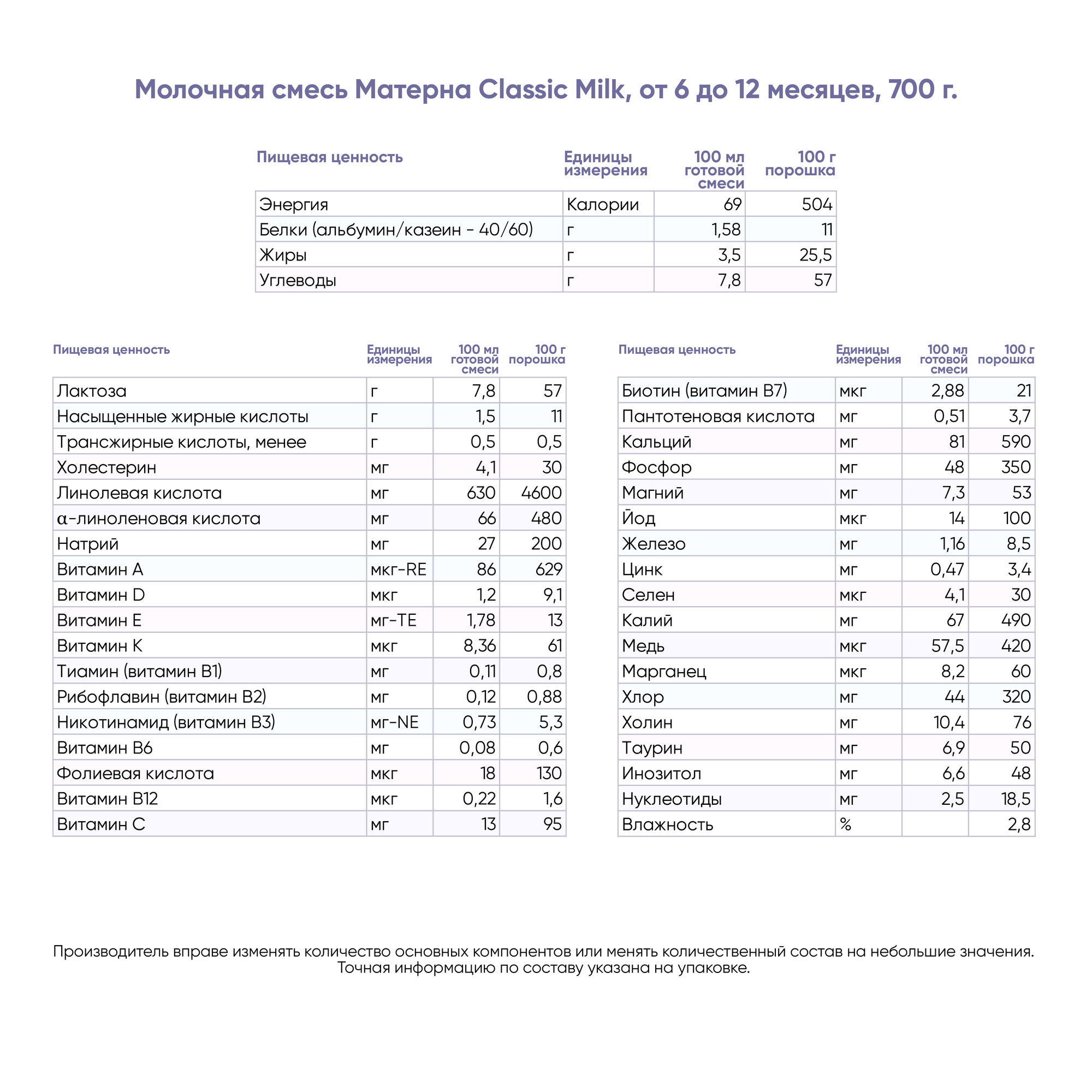 Materna Молочная смесь Матерна Classic Milk, от 6 до 12 месяцев, 700 г. информация: