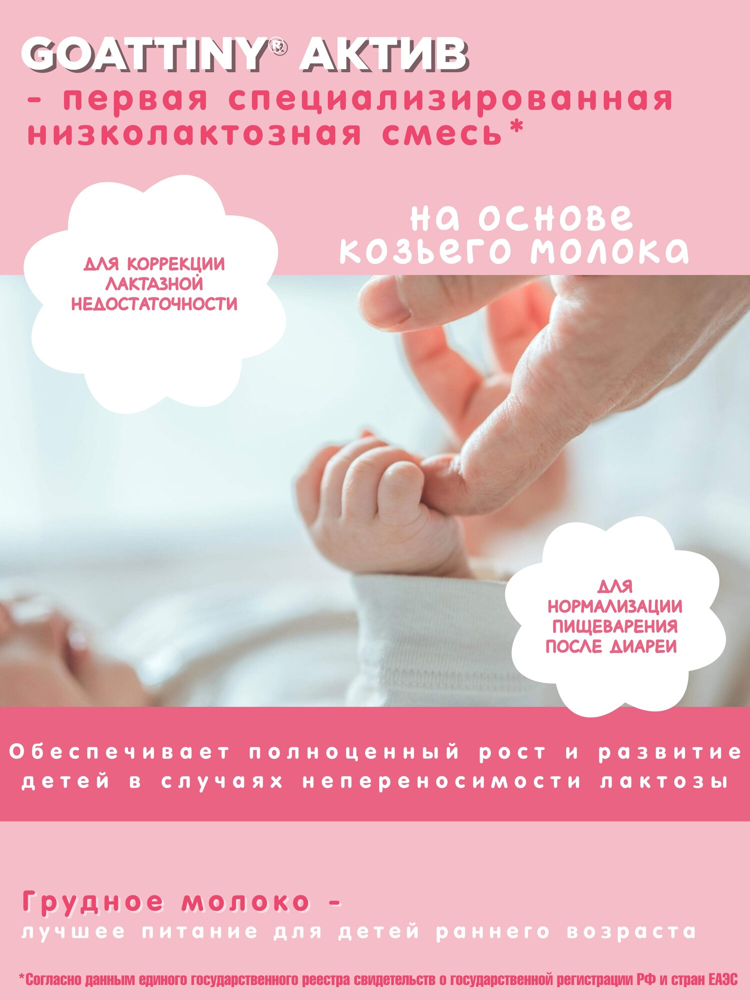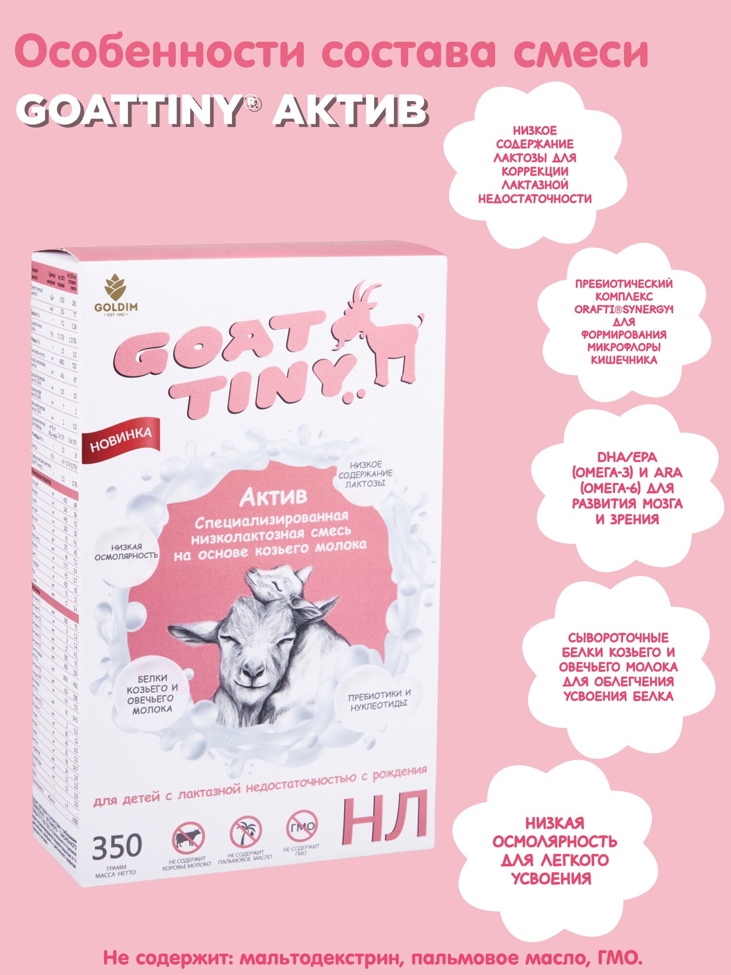 Низколактозная смесь GOATTINY АКТИВ на основе козьего молока для детей с лактазной недостаточностью, 350 г. информация: