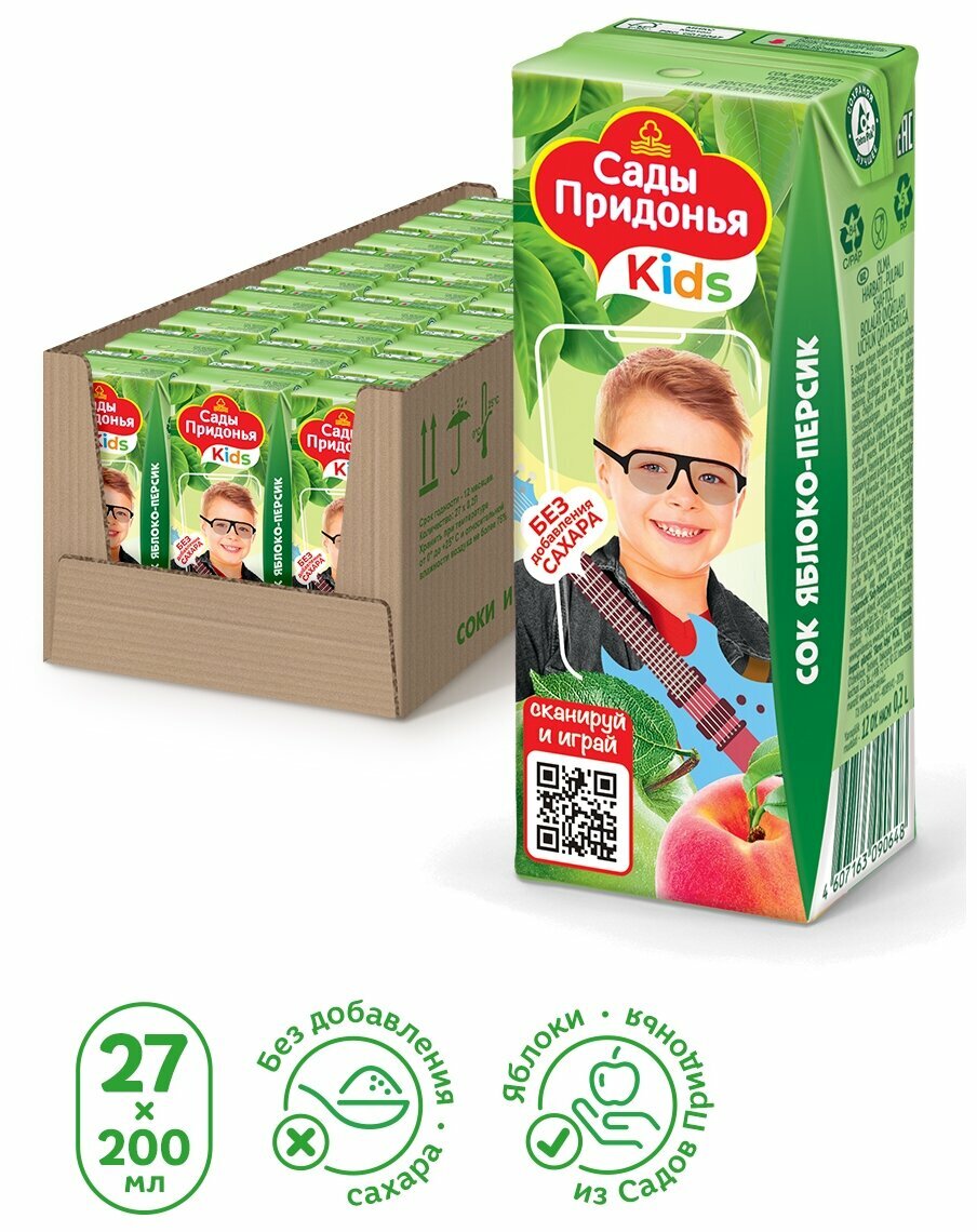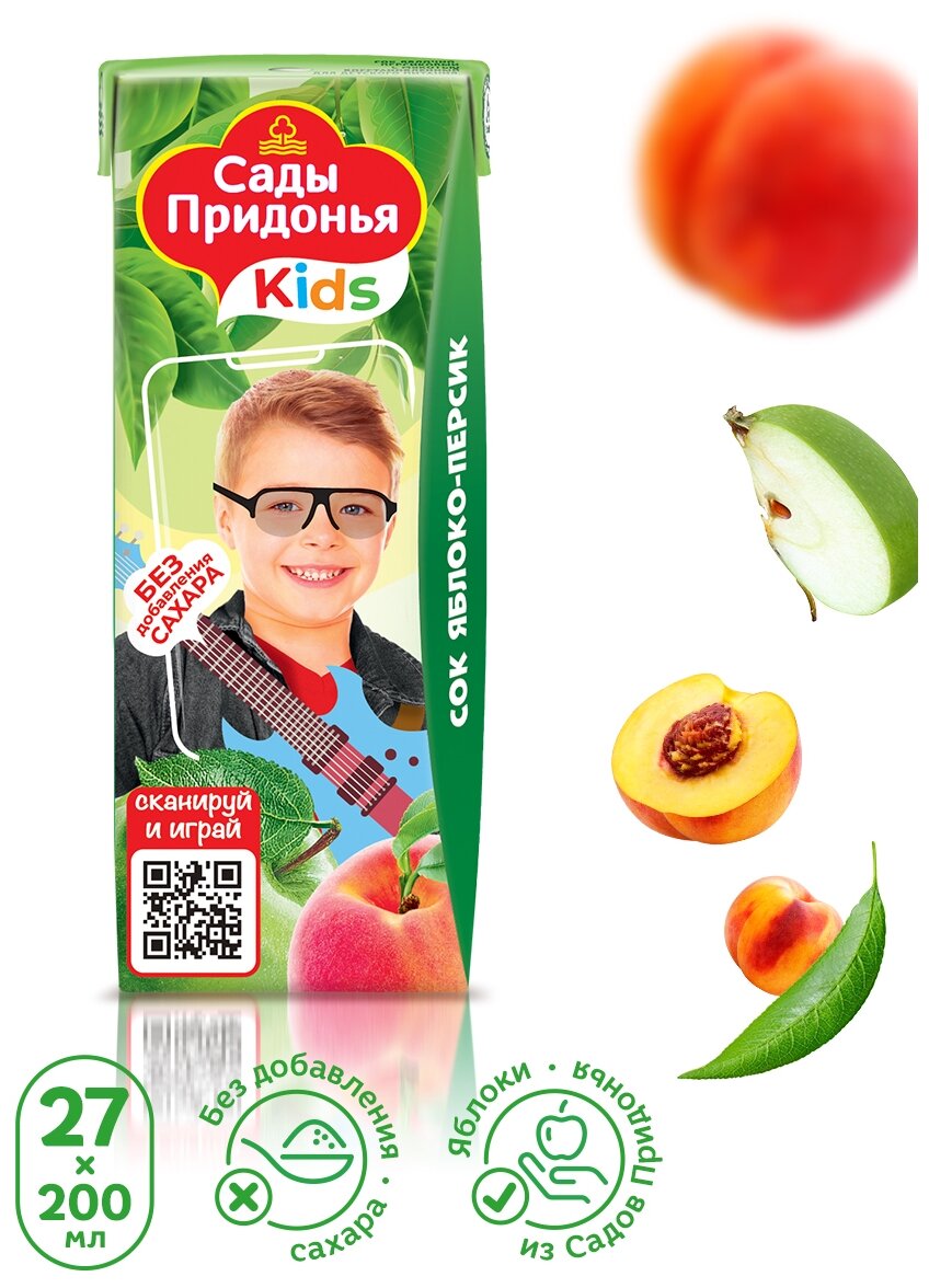 Сады придонья Сок с яблоком и персиком с мякотью восстановленный без сахара с 5 месяцев, 200 мл, 27 шт. информация: