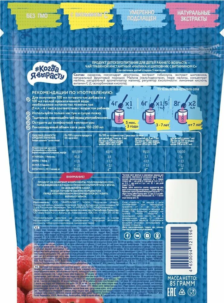 Чай Когда Я Вырасту, без сахара, малина-шиповник, для детей с витамином С, 85 гр. информация: