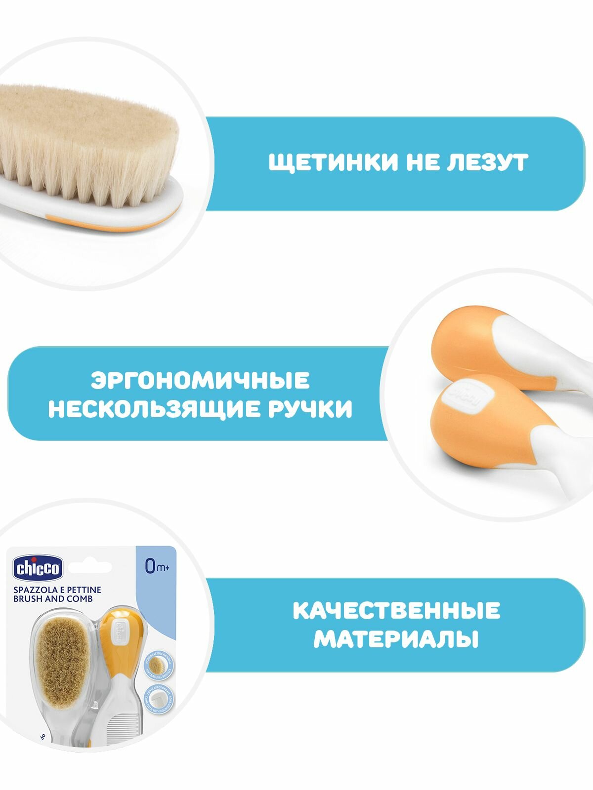 Отзывы на Набор детский Chicco расческа и щетка с натуральной щетиной для малышей 0+, оранжевая