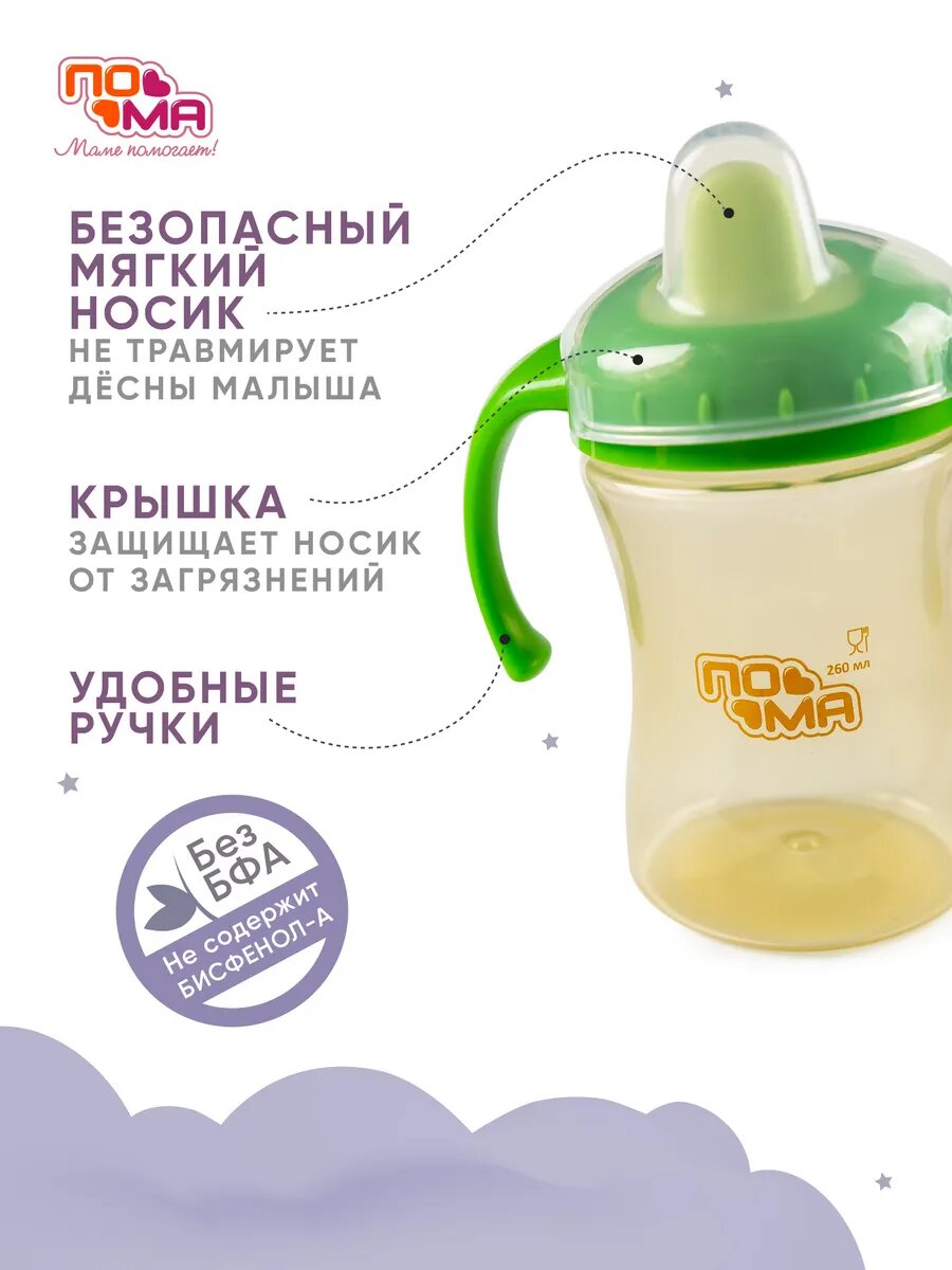 Поильник-непроливайка ПОМА, силикон, 260мл, от 6 мес, с мягким носиком информация: