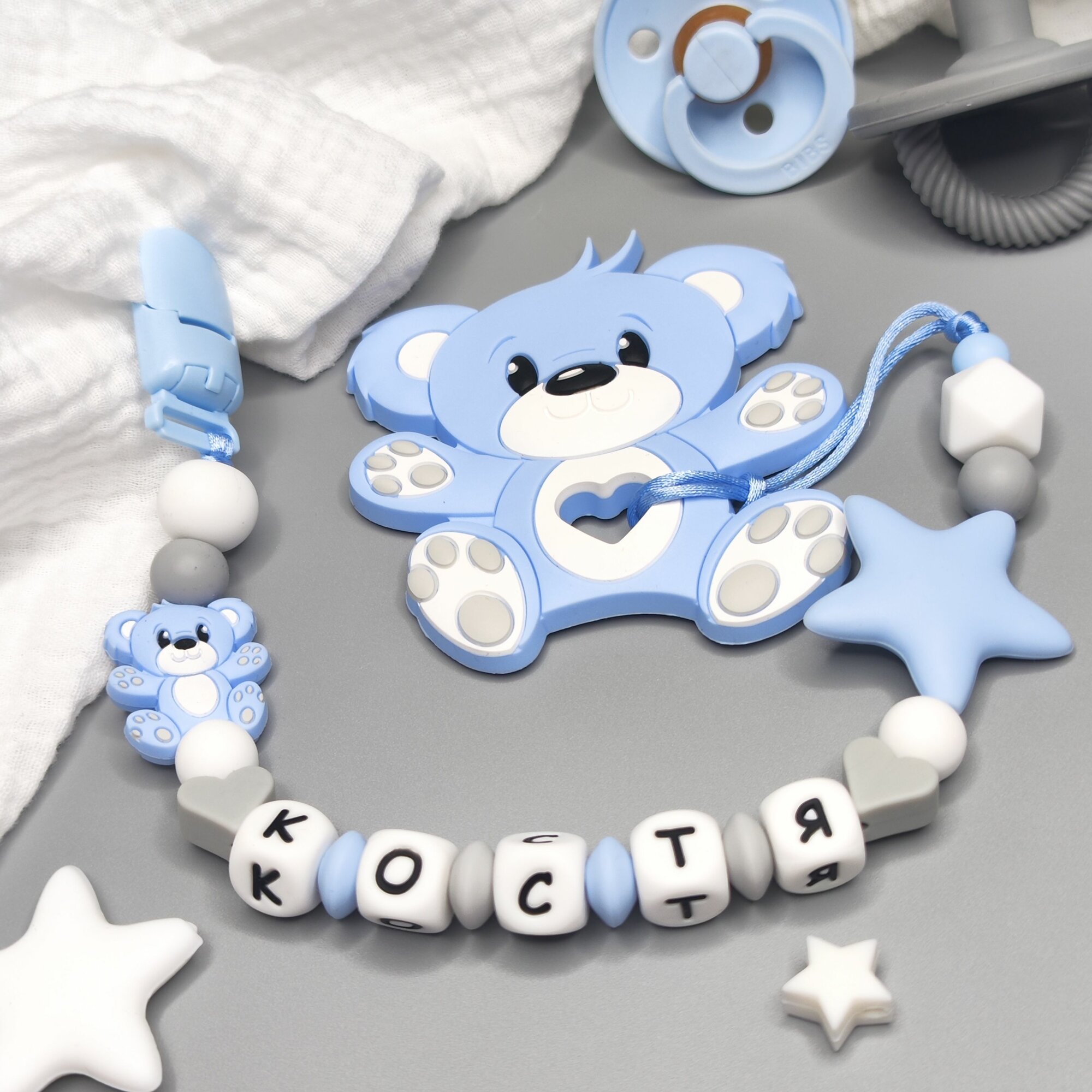10 цен на Именной силиконовый держатель для пустышки с грызунком - Костя, Константин, для новорожденных, прорезыватель