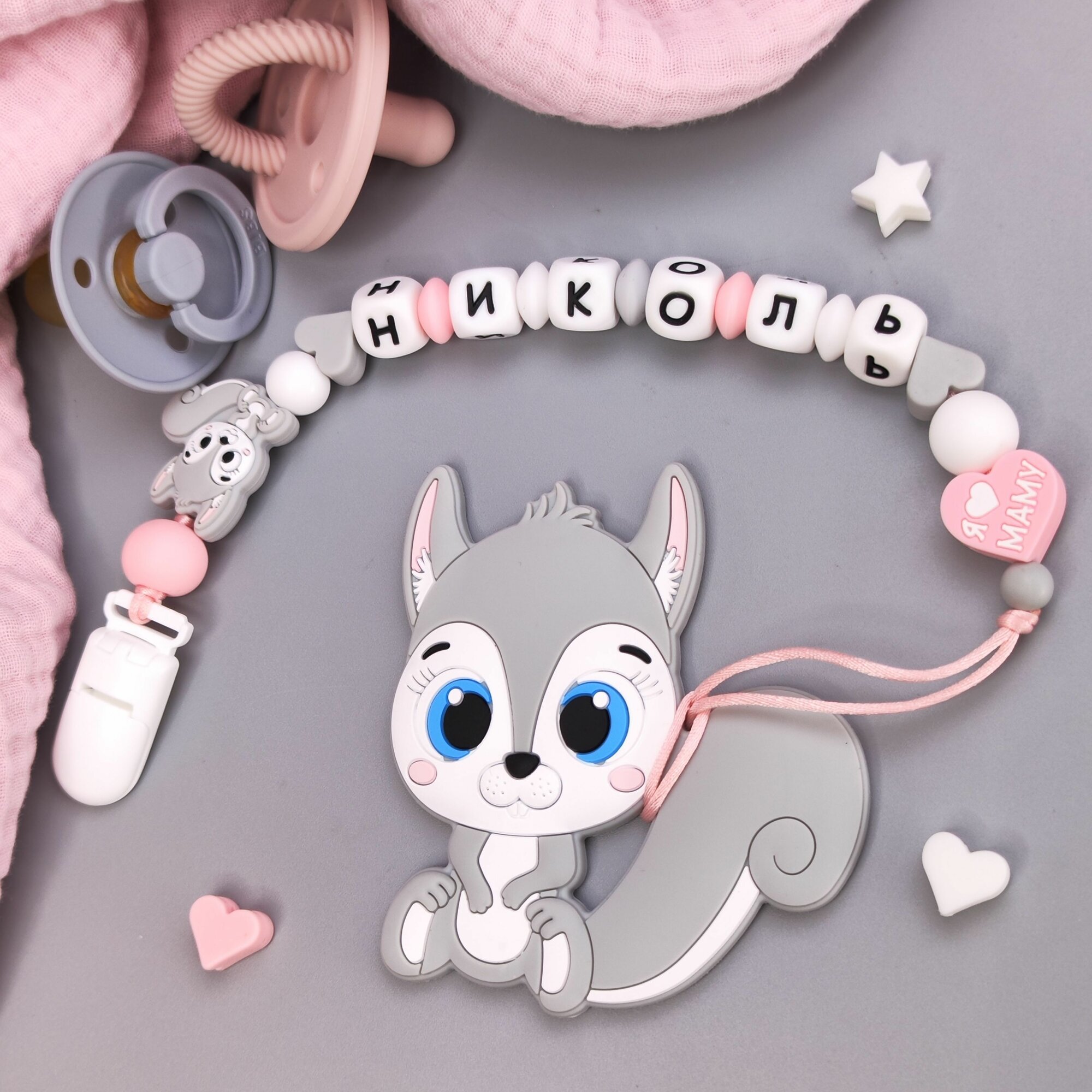 Именной силиконовый держатель для пустышки с грызунком - Николь, прорезыватель информация: