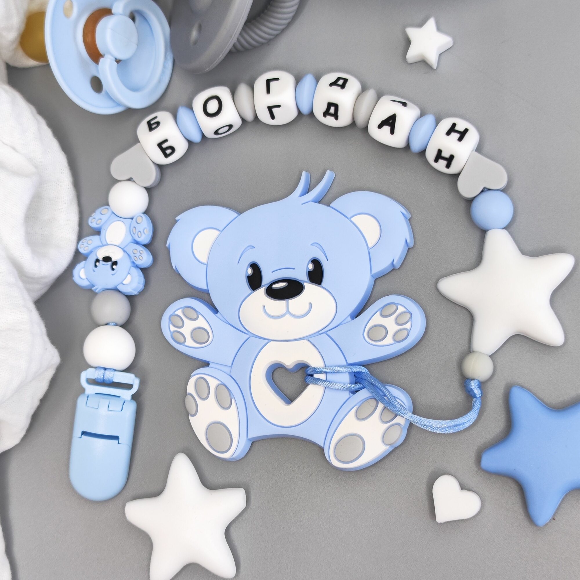 Именной силиконовый держатель для пустышки с грызунком - Богдан, для новорожденных, прорезыватель информация: