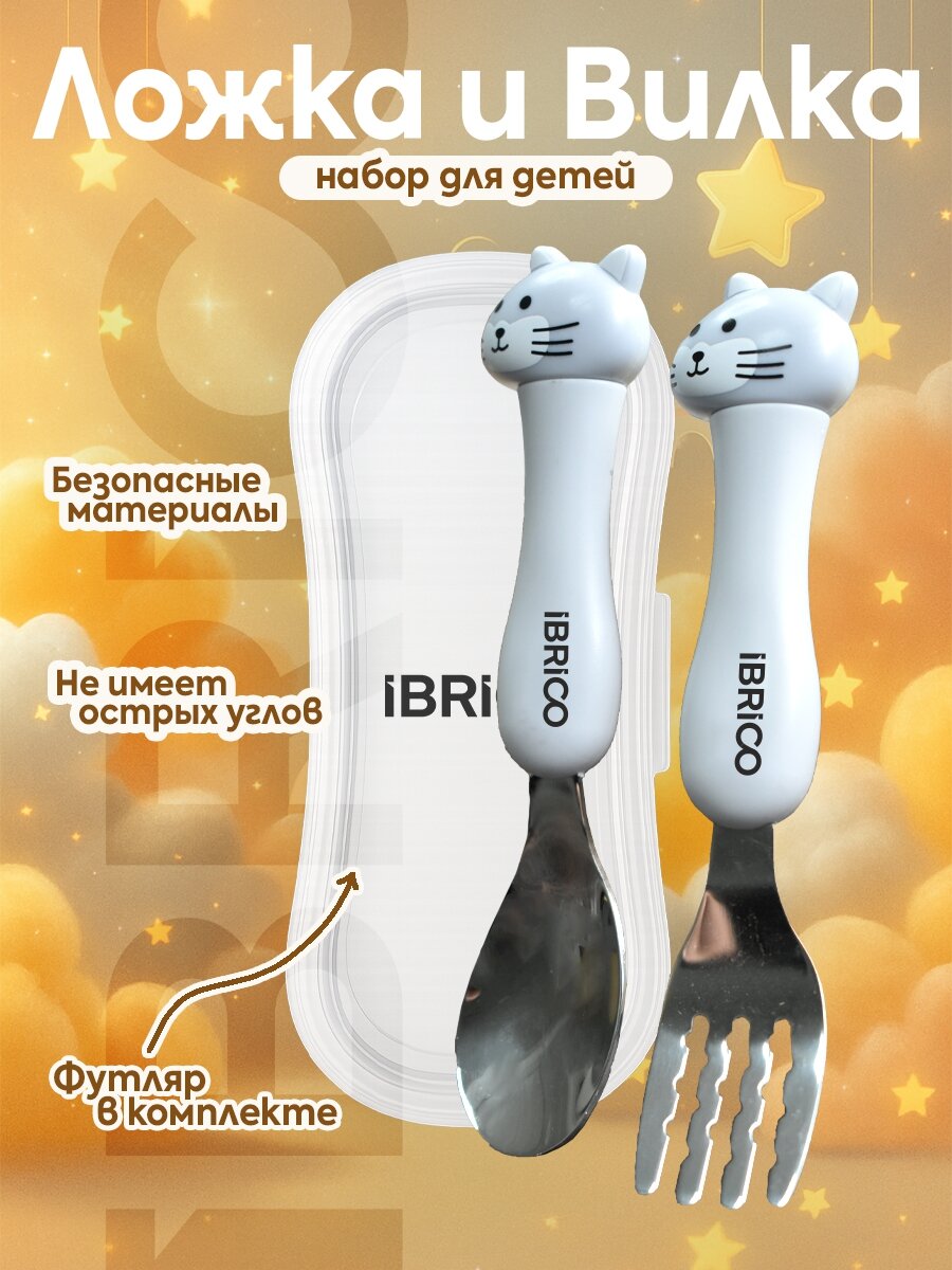 10 цен на Набор для кормления детский IBRICO, с футляром, вилка, ложка, светло-серые