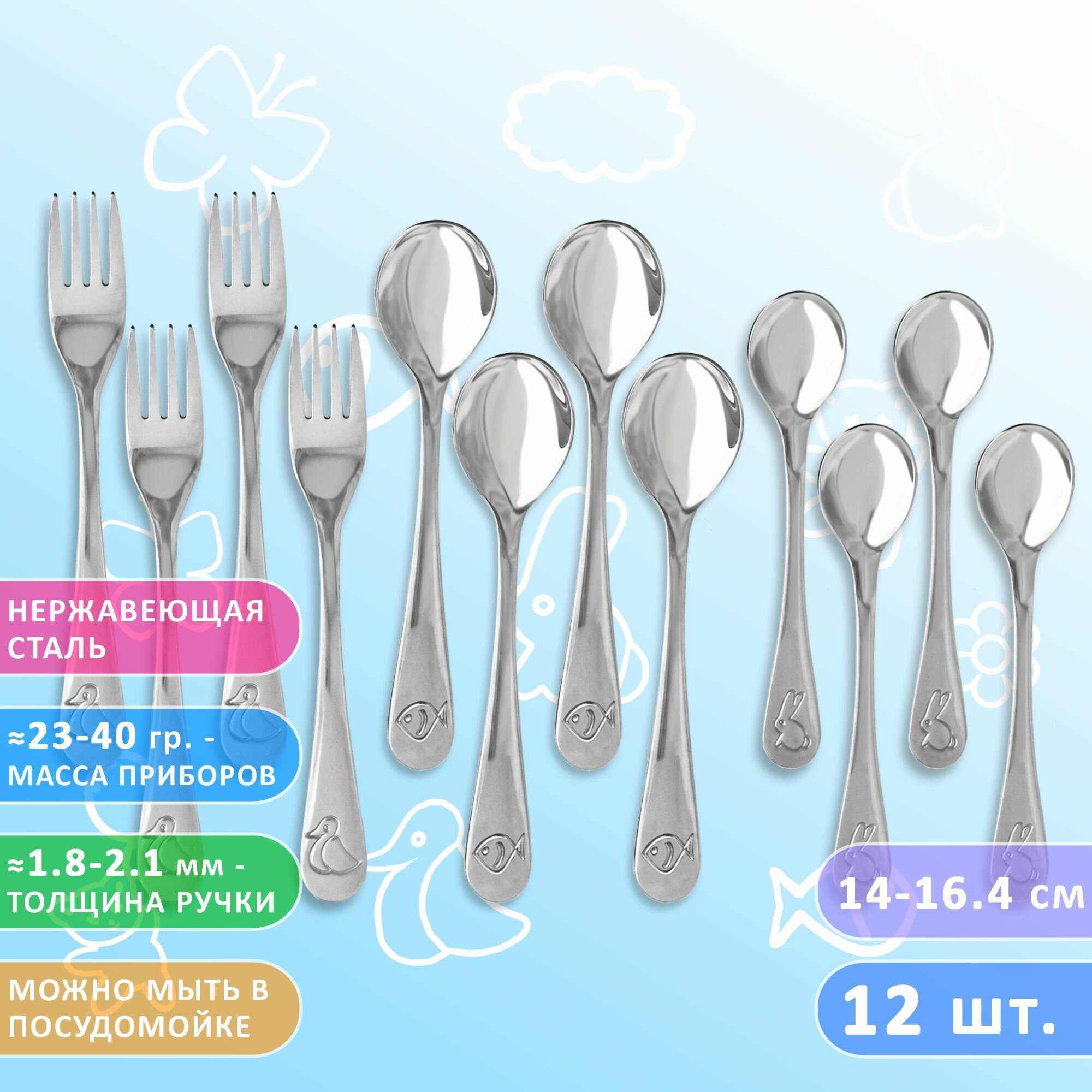 Набор детских столовых приборов VELERCART KIDS Зоопарк (4 столовые ложки, 4 вилки и 4 чайные ложки), 12 предметов информация: