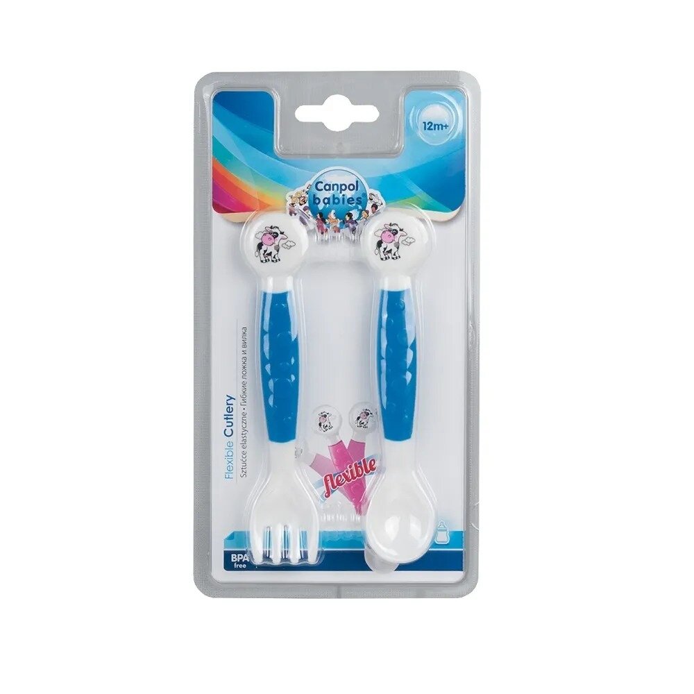 Набор Canpol Babies Вилка и ложка гибкие Little cow, 12м+, синий информация: