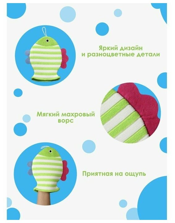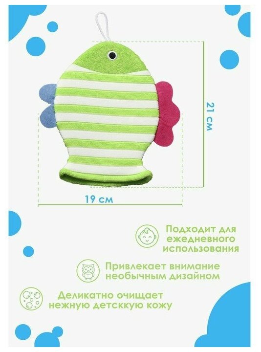 Мочалка-варежка детская для купания Доляна «Рыбка», 19×21 см, полосатая, цвет микс, 143045 информация: