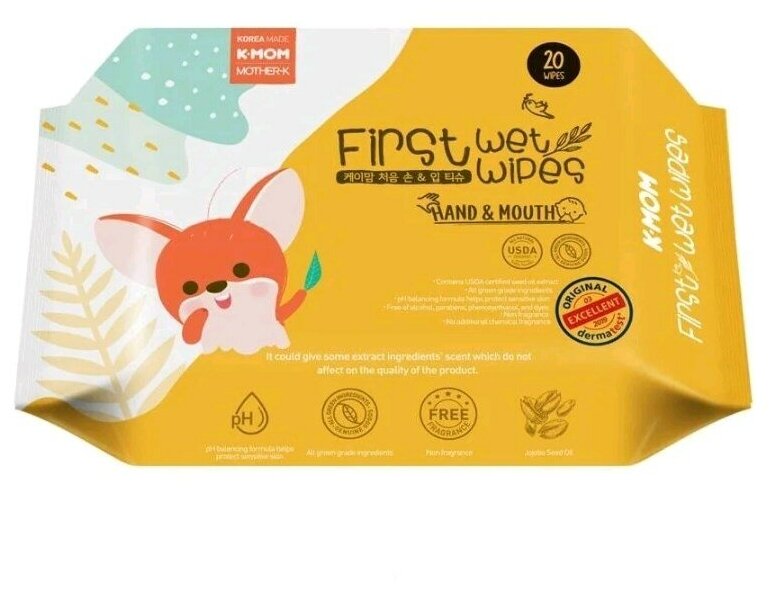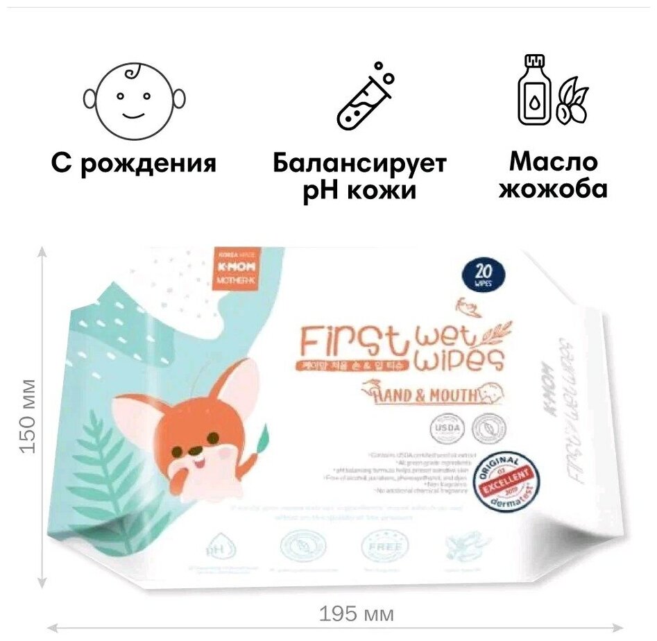 Детские влажные салфетки для рук и рта K-MOM First Wet Wipes 20 листов 0+ информация: