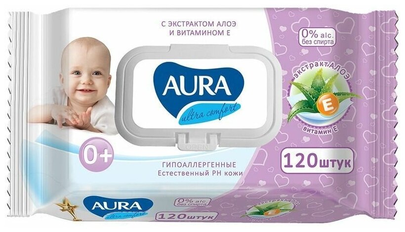 10 цен на Влажные салфетки для детей AURA Ultra Comfort 120шт с экстрактом алоэ и витамином Е с крышкой