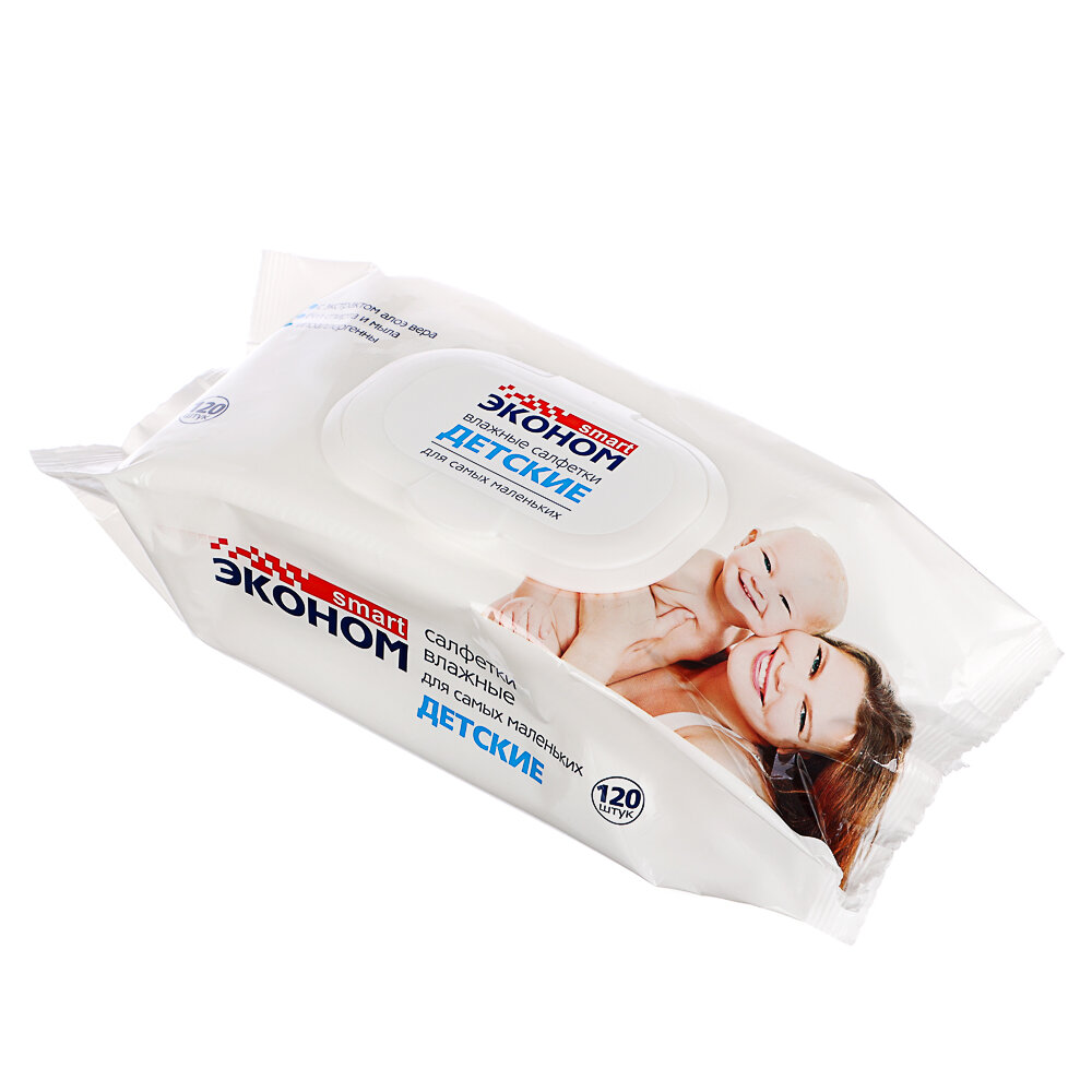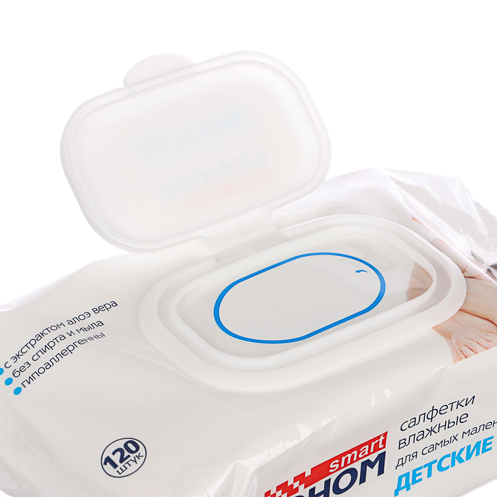 10 цен на Салфетки влажные детские 120шт СМАРТ Эконом, с клапаном, с экстрактом алоэ вера