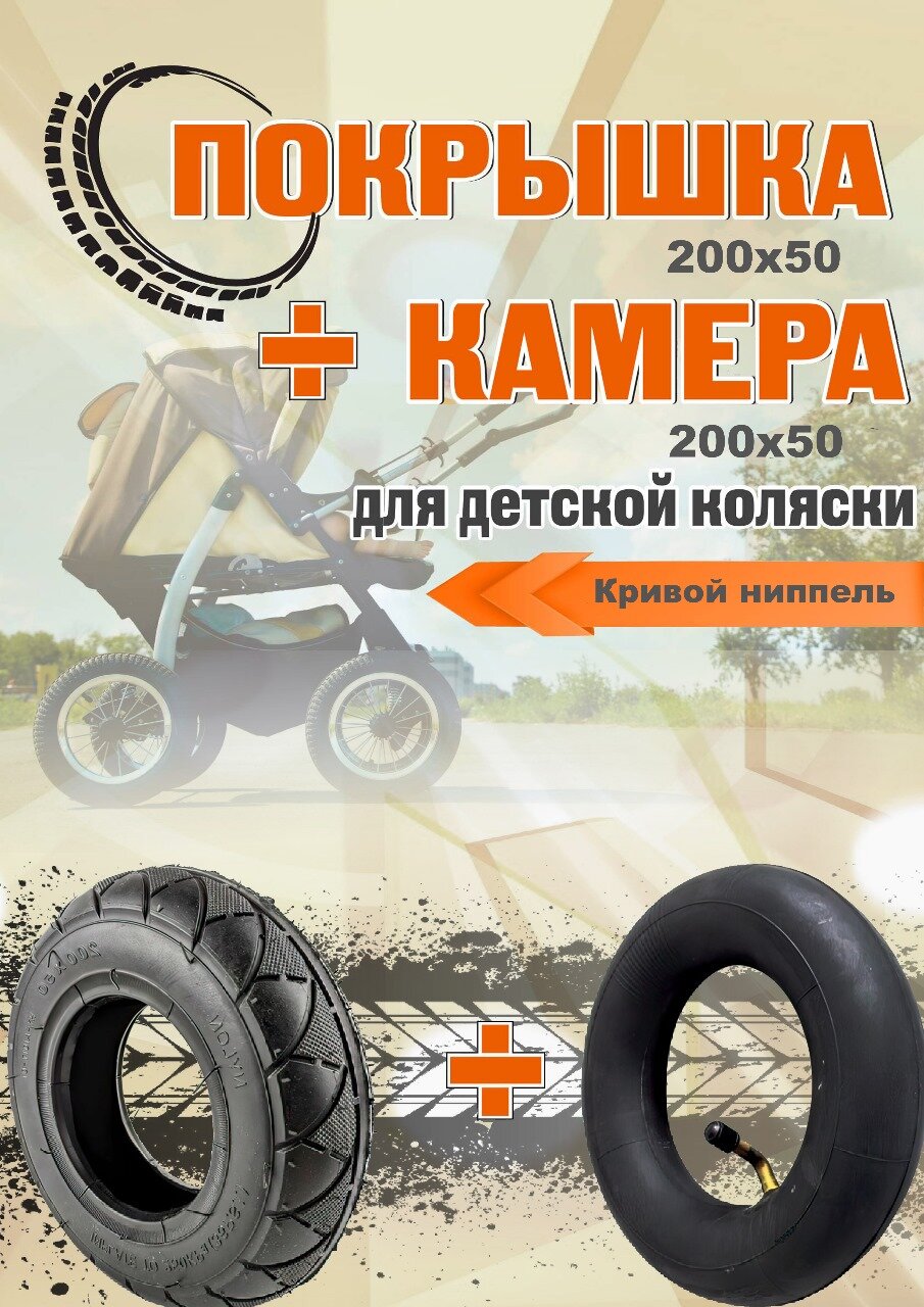 Покрышка 200х50 + Камера 200х50 кривой ниппель для коляски, цвет черный информация: