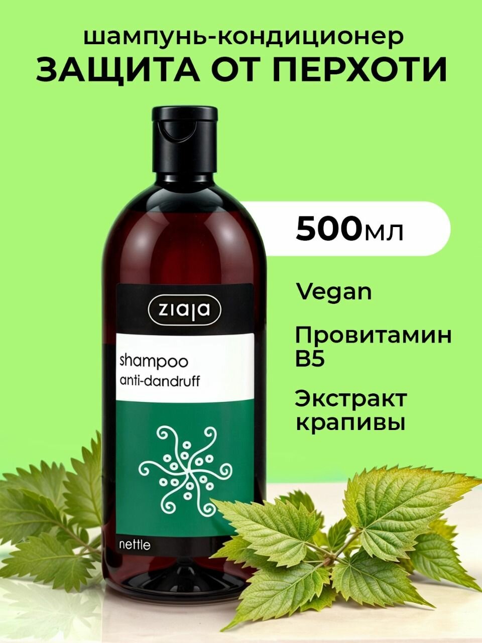 Шампунь для волос женский Ziaja 500 мл, против перхоти, для всех типов волос, с экстрактом крапивы, очищение и увлажнение информация: