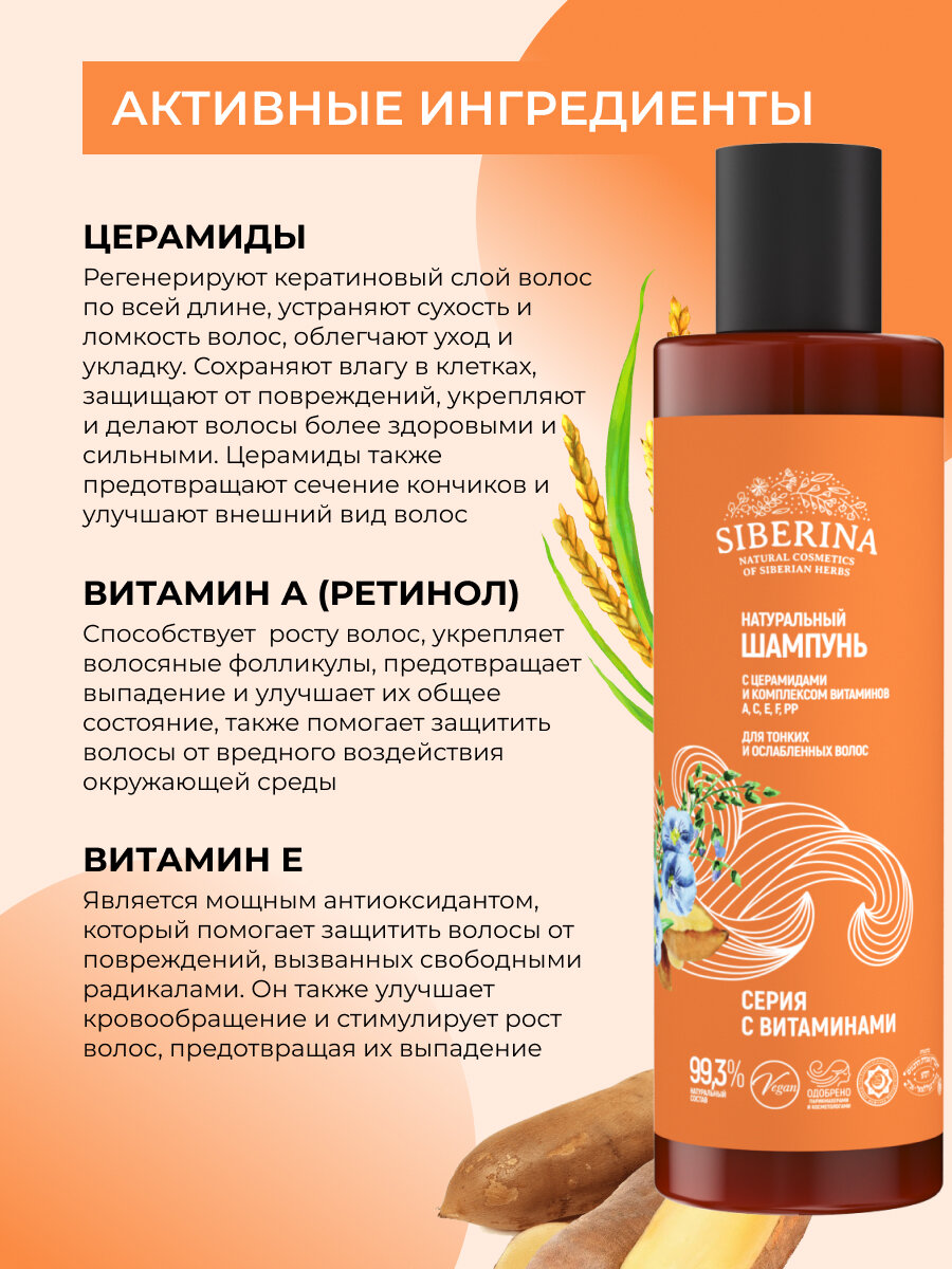 Siberina Натуральный шампунь с церамидами и комплексом витаминов А, С, Е, F РР для тонких и ослабленных волос, 200 мл информация: