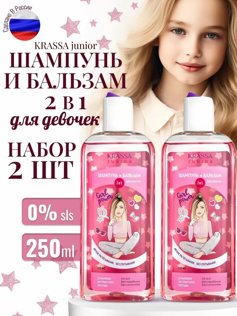10 цен на Детский шампунь и бальзам 2 в 1 для девочек набор 2 шт KRASSA Junior, 0% SLS, с Д-Пантенолом, с Пептидами, Без Парабенов, Без Силиконов, 250 мл