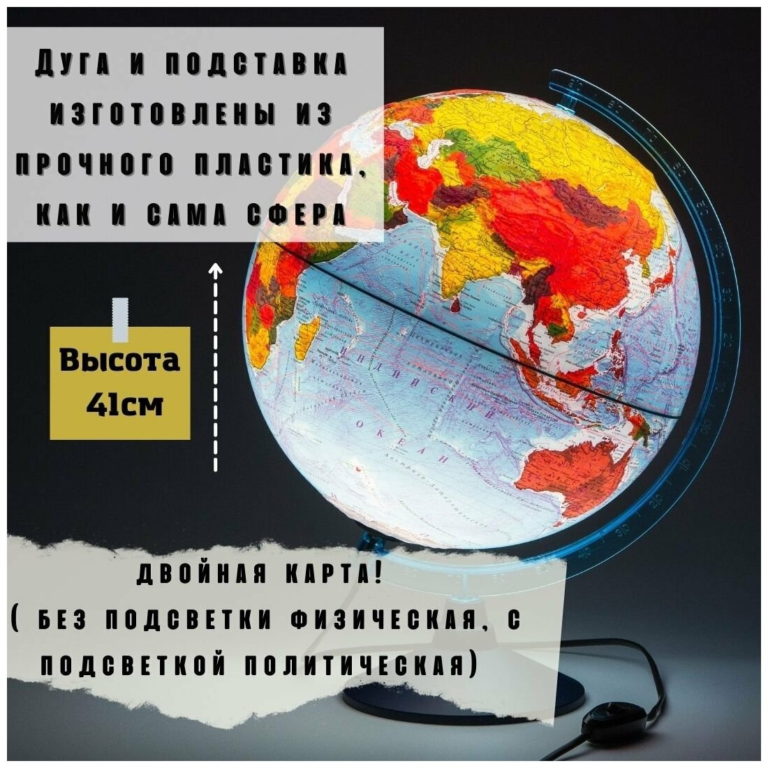 Глобус физико-политический с подсветкой рельефный Globusoff, d=32 см информация: