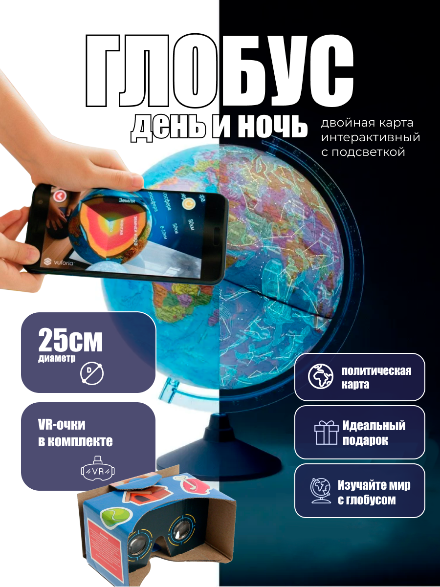 10 цен на Интерактивный Глобус Globen День и ночь, с подсветкой и двойной картой, с VR очками, 25см