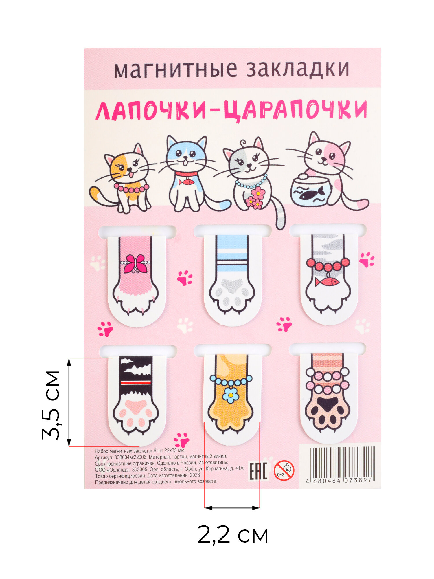 Набор магнитных закладок "Лапочки" (6шт 22х35мм), закладка для книг информация: