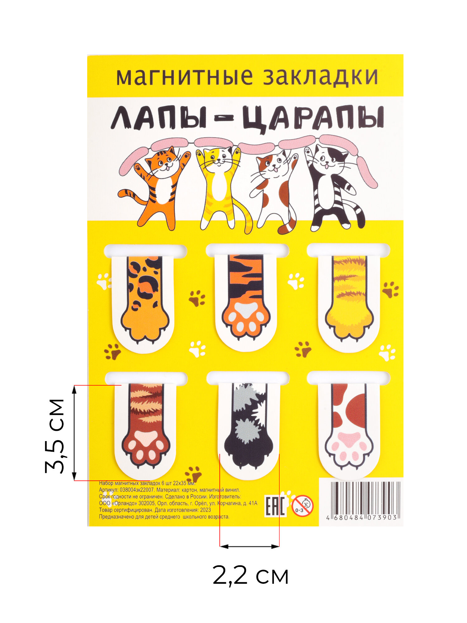 Набор магнитных закладок "Лапы" (6шт 22х35мм), закладка для книг информация: