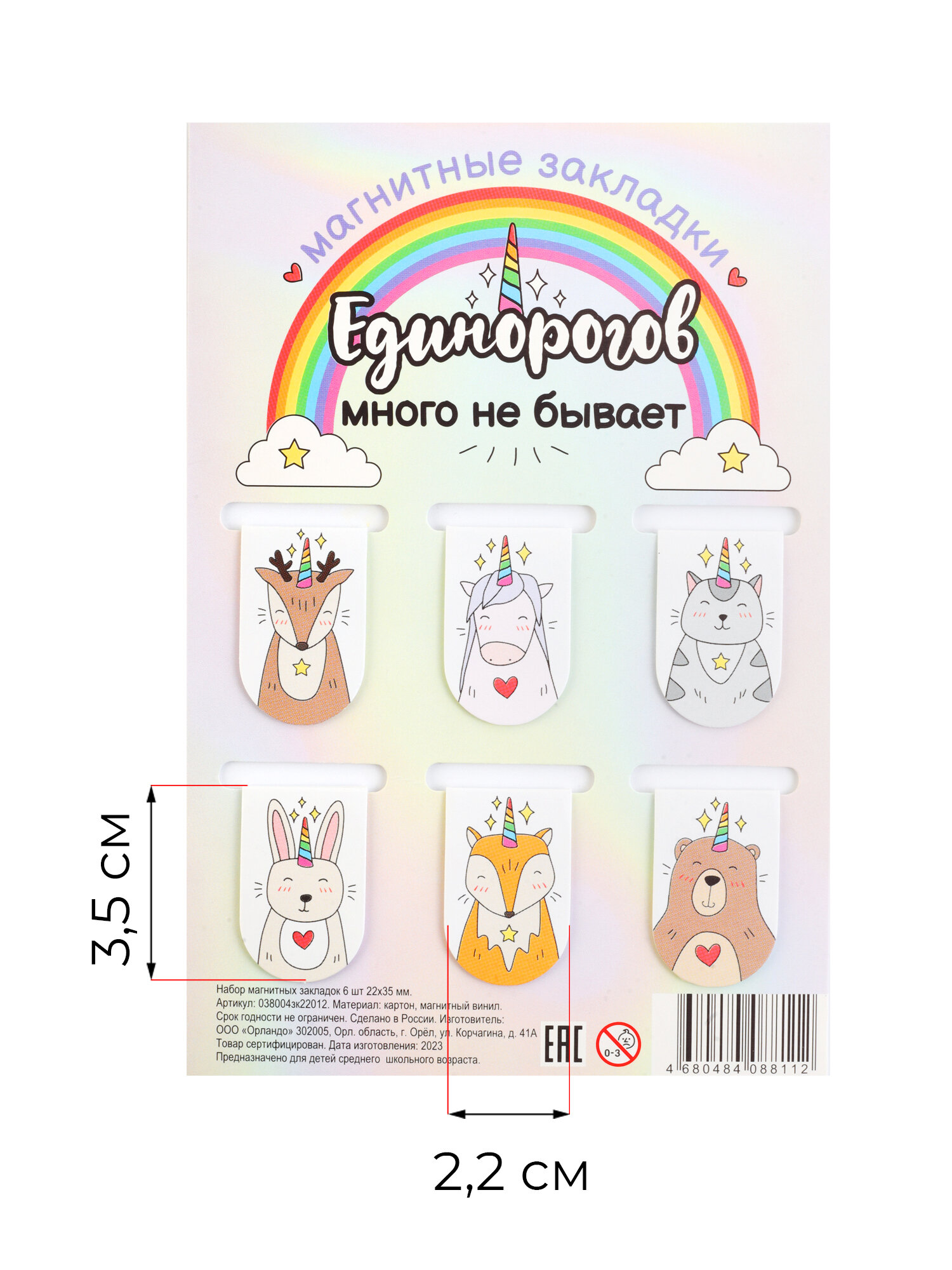 Набор магнитных закладок 6 шт 22х35 мм "Единорогов много не бывает" / Закладка для книги информация:
