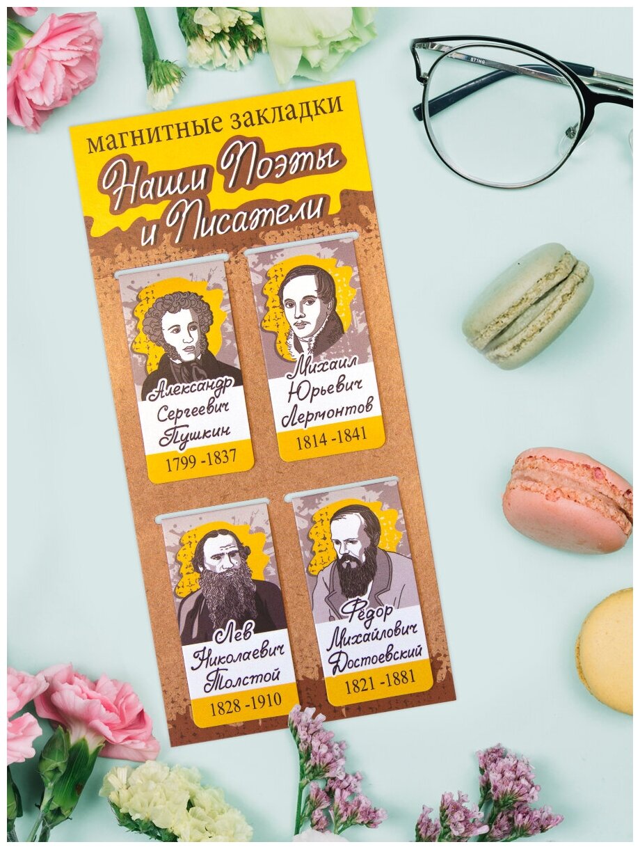 10 цен на Набор магнитных закладок "Наши поэты и писатели: Пушкин. Лермонтов, Толстой, Достоевский" (35х70мм), закладка для книг