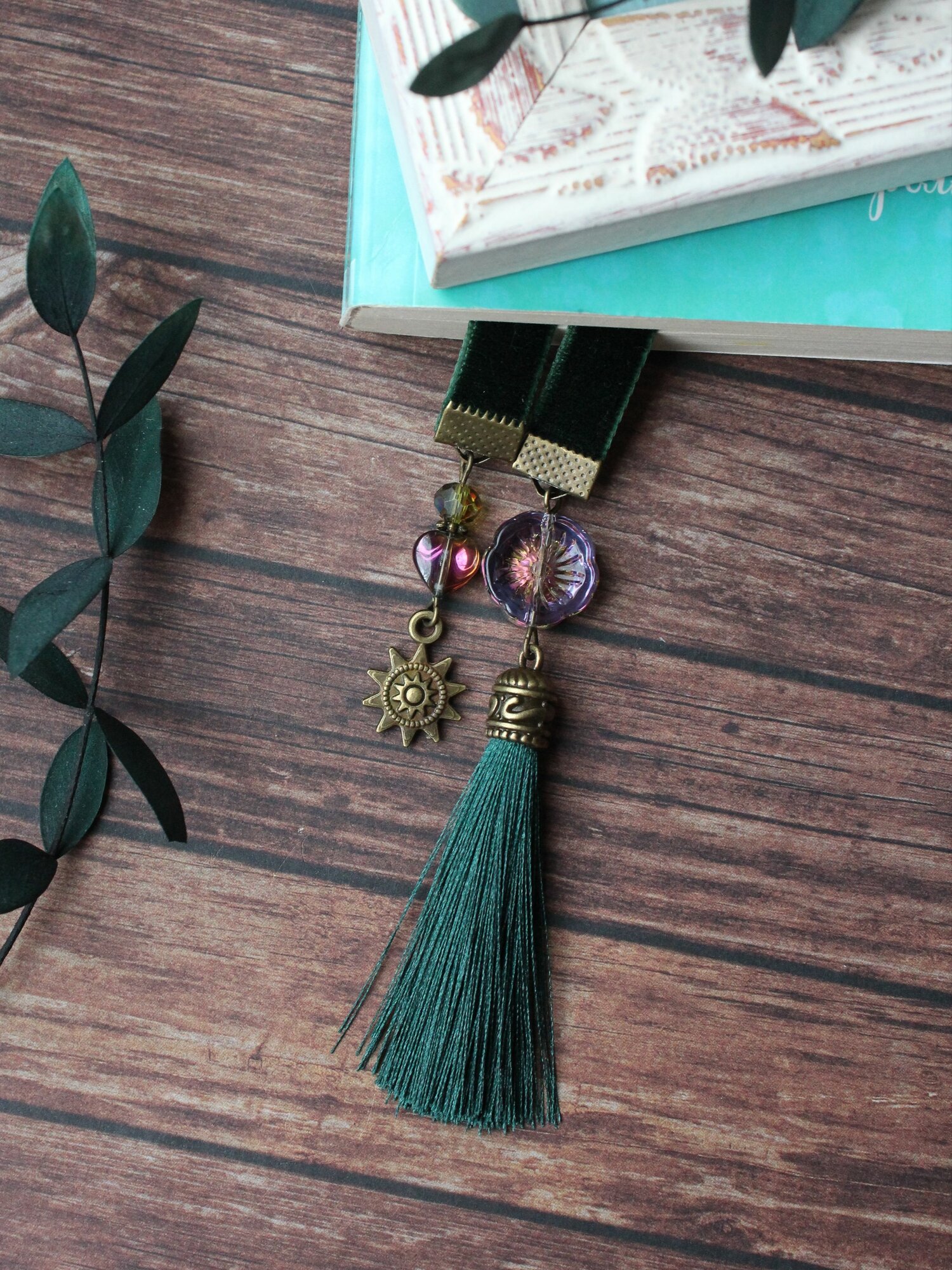 10 цен на Закладка подарочная "Бохо солнце", зеленая бархатная лента для книги, готовый подарок девушке подруге сестре жене