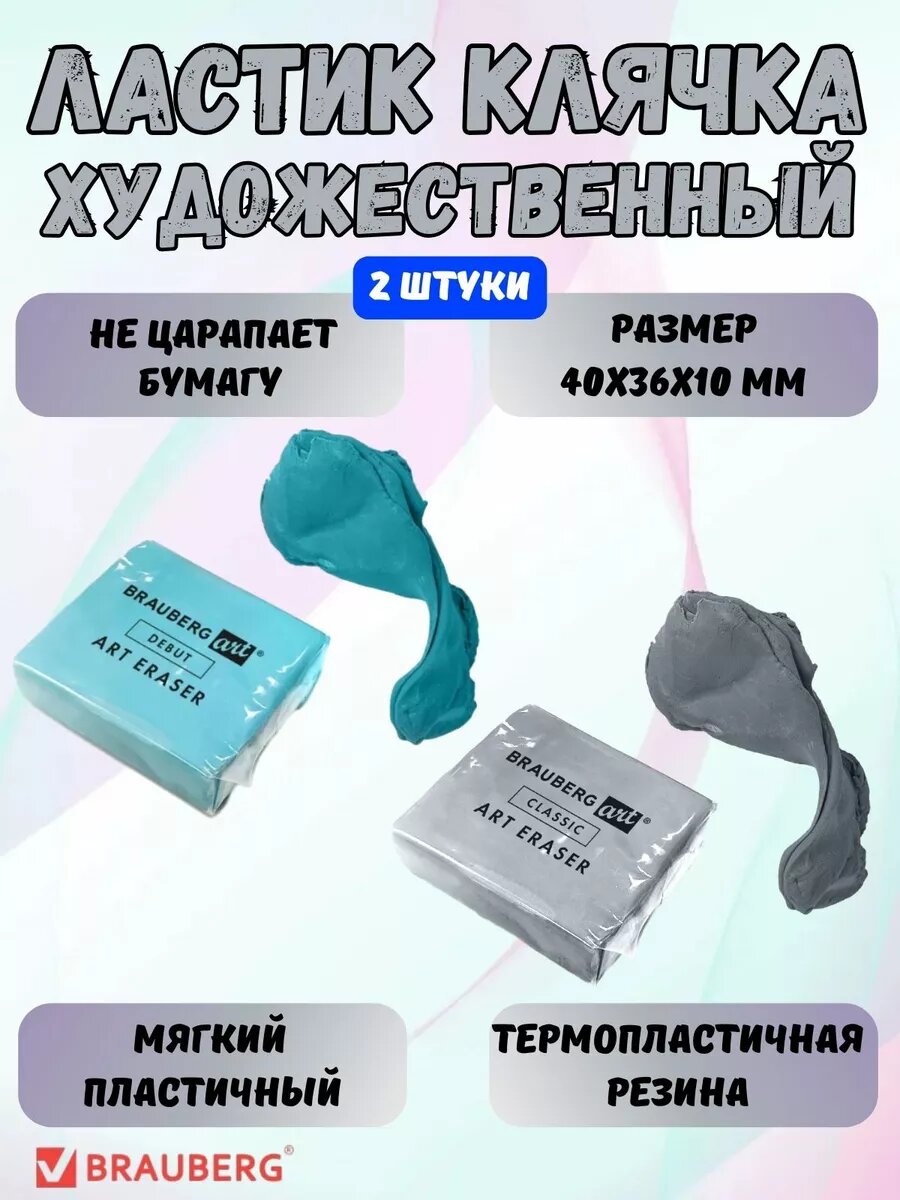 Комплект 50 шт, Ластик-клячка художественный BRAUBERG ART "CLASSIC" 40х36х10 мм, супермягкий, серый, 228064 1 614 ₽