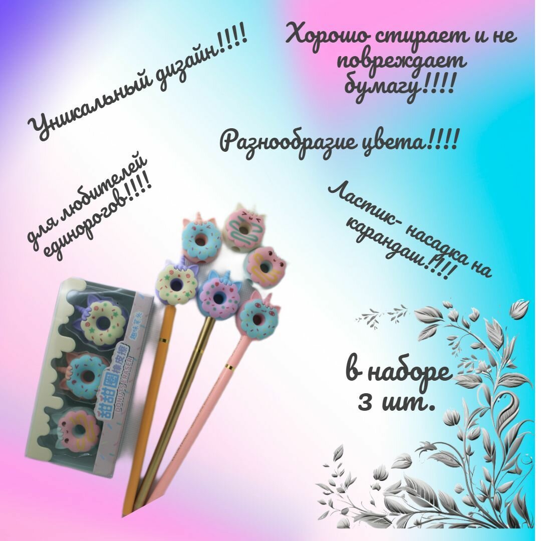Отзывы на Ластик-насадка на карандаш "ПОНЧИК mini" в форме пончика-единорожки в наборе 3 (шт.)