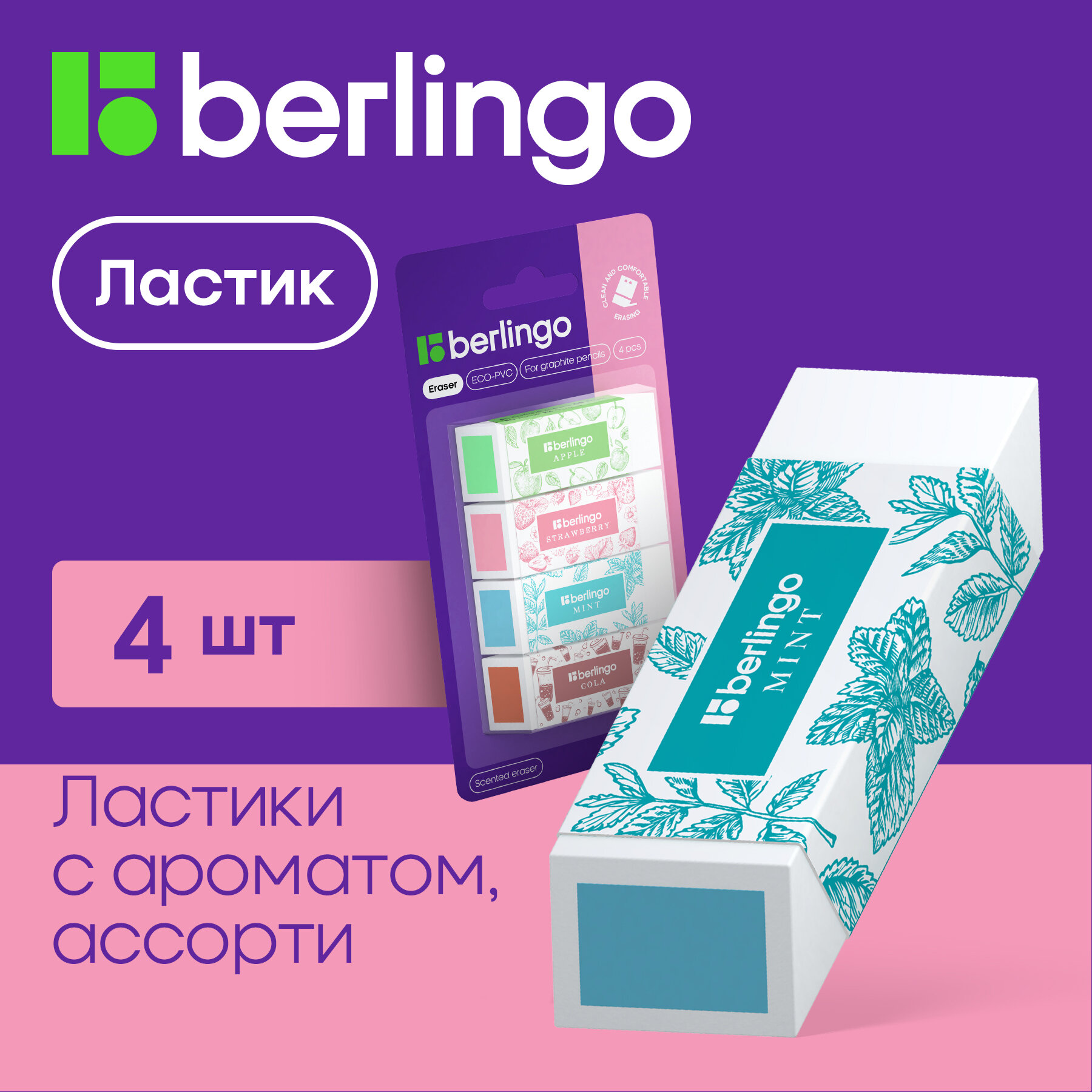 10 цен на Ластики для школы Berlingo Aroma стирательная резинка канцелярская, стерка для карандаша с запахом, набор 4 шт, 58х22х20 мм