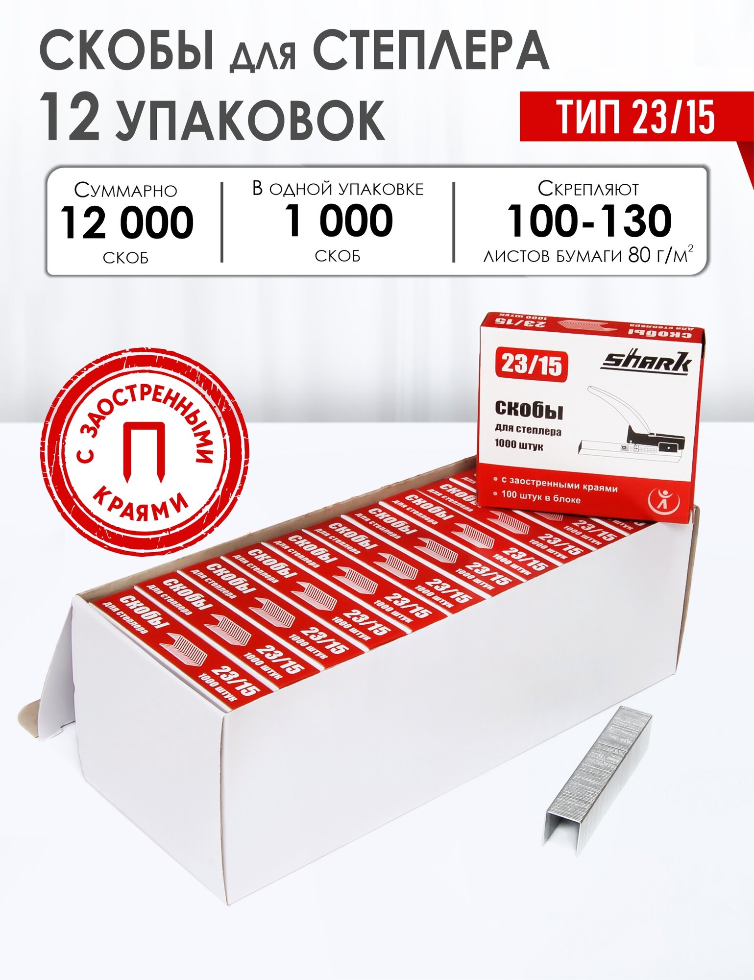 Скобы 23/15 с заостренными краями, 12 пачек по 1000 шт, Shark, степлируют от 100 до 130 листов бумаги 80 г/кв. м. информация: