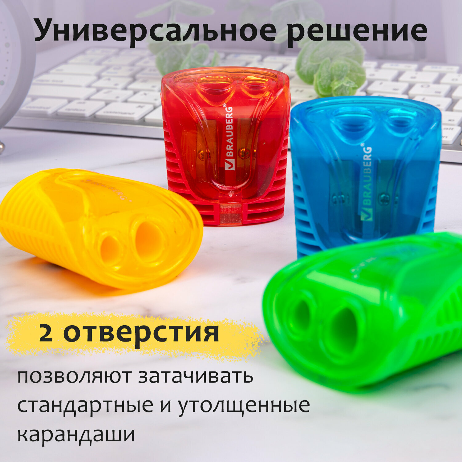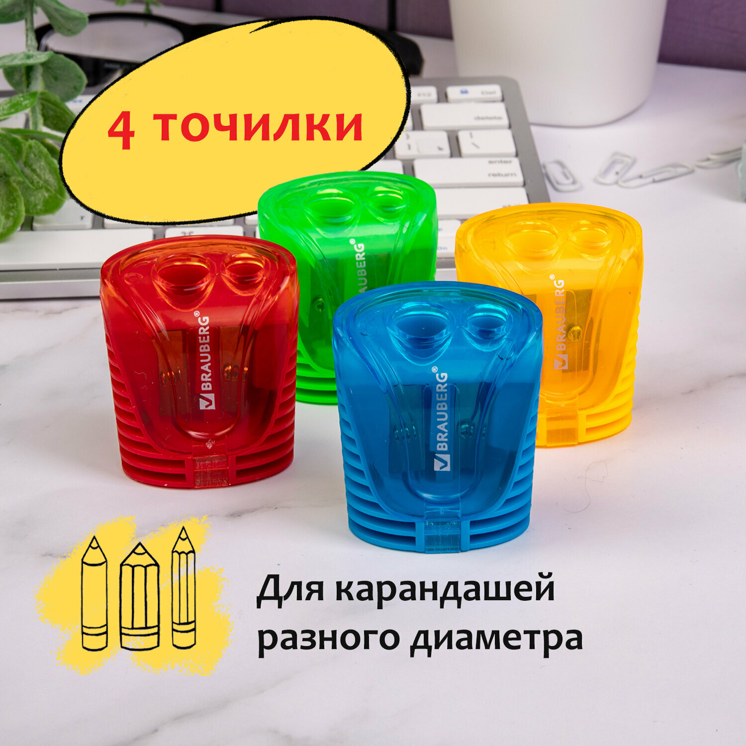Точилка для карандашей 2 диаметров с контейнером BRAUBERG Cell Dual, комплект 4 шт, ассорти, 880444 информация: