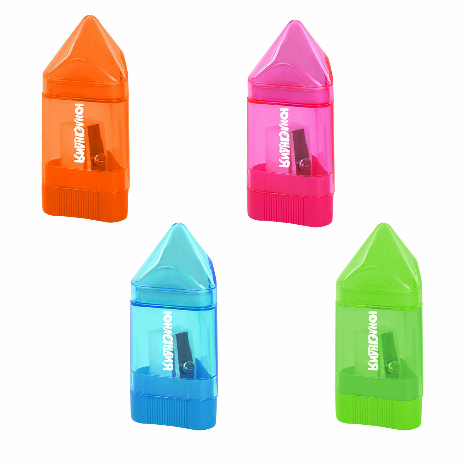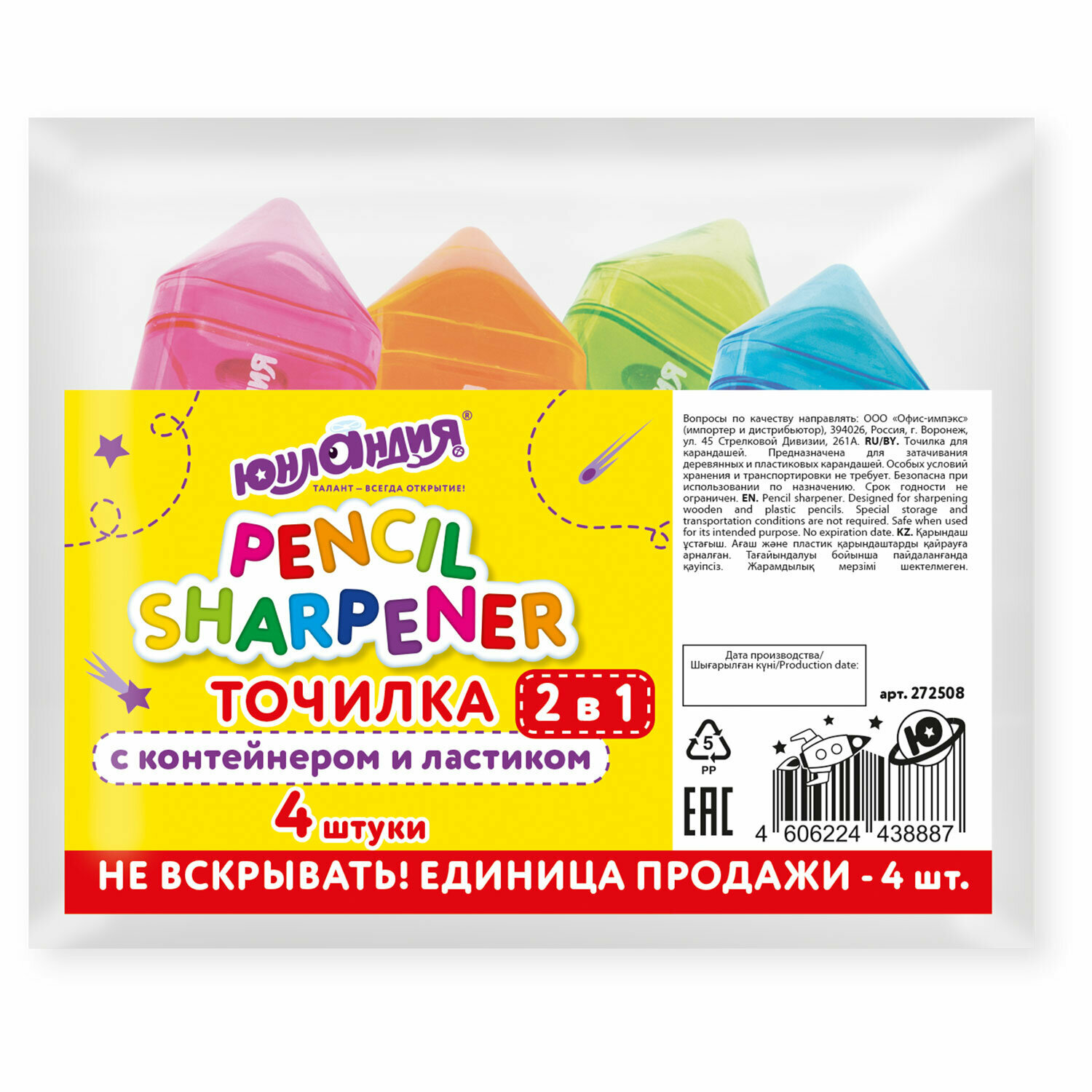 Точилка для простых и цветных карандашей с ластиком, набор 4 штуки в школу, с контейнером, Юнландия Карандашик, 272508 информация:
