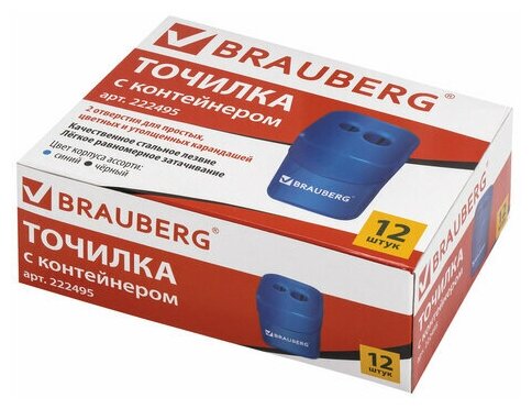 Точилка BRAUBERG "Win", 2 отверстия для чернографитных карандашей (в том числе утолщенных), с большим контейнером, с крышкой, ассорти информация: