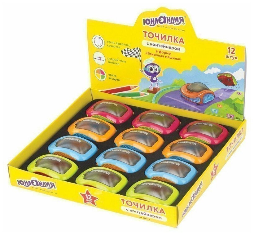 10 цен на Точилка юнландия "Гонки", с контейнером, пластиковая, корпус ассорти, 228473