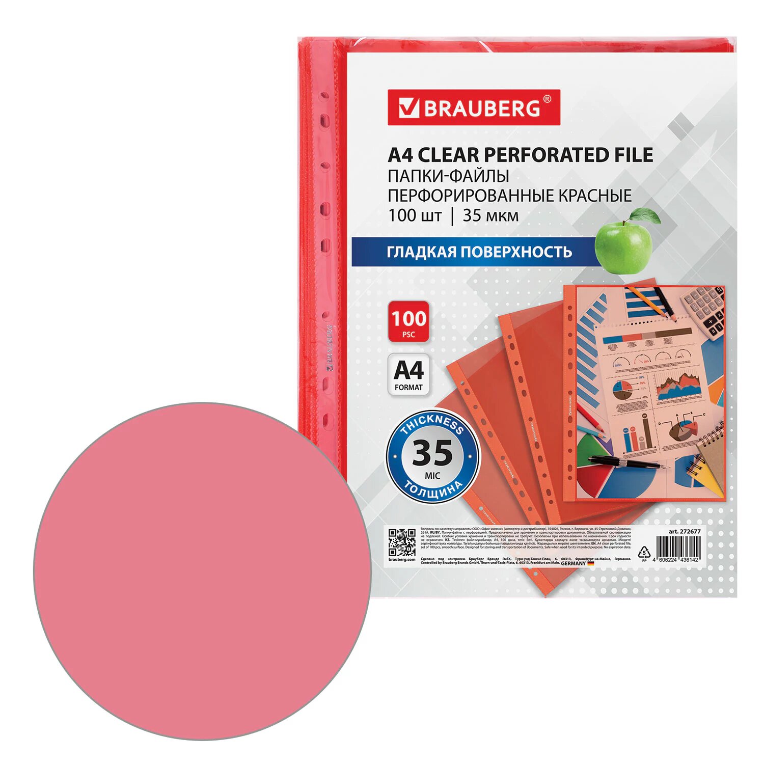 10 цен на Файлы А4 100 штук перфорированные гладкие, вкладыши в папки для документов и бумаг, мультифора, 35 мкм, красные, Brauberg, 272677