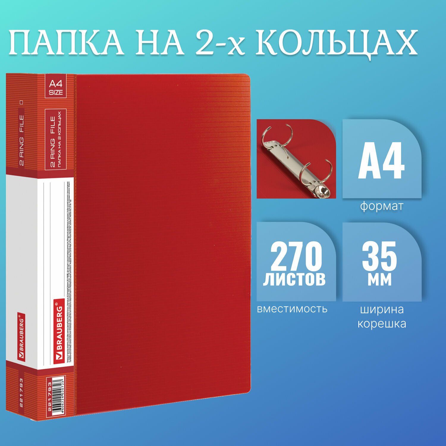 Папка для документов и бумаг на 2 кольцах канцелярская Brauberg Contract, 35 мм, красная, до 270 листов, 0,9 мм, 221793 информация:
