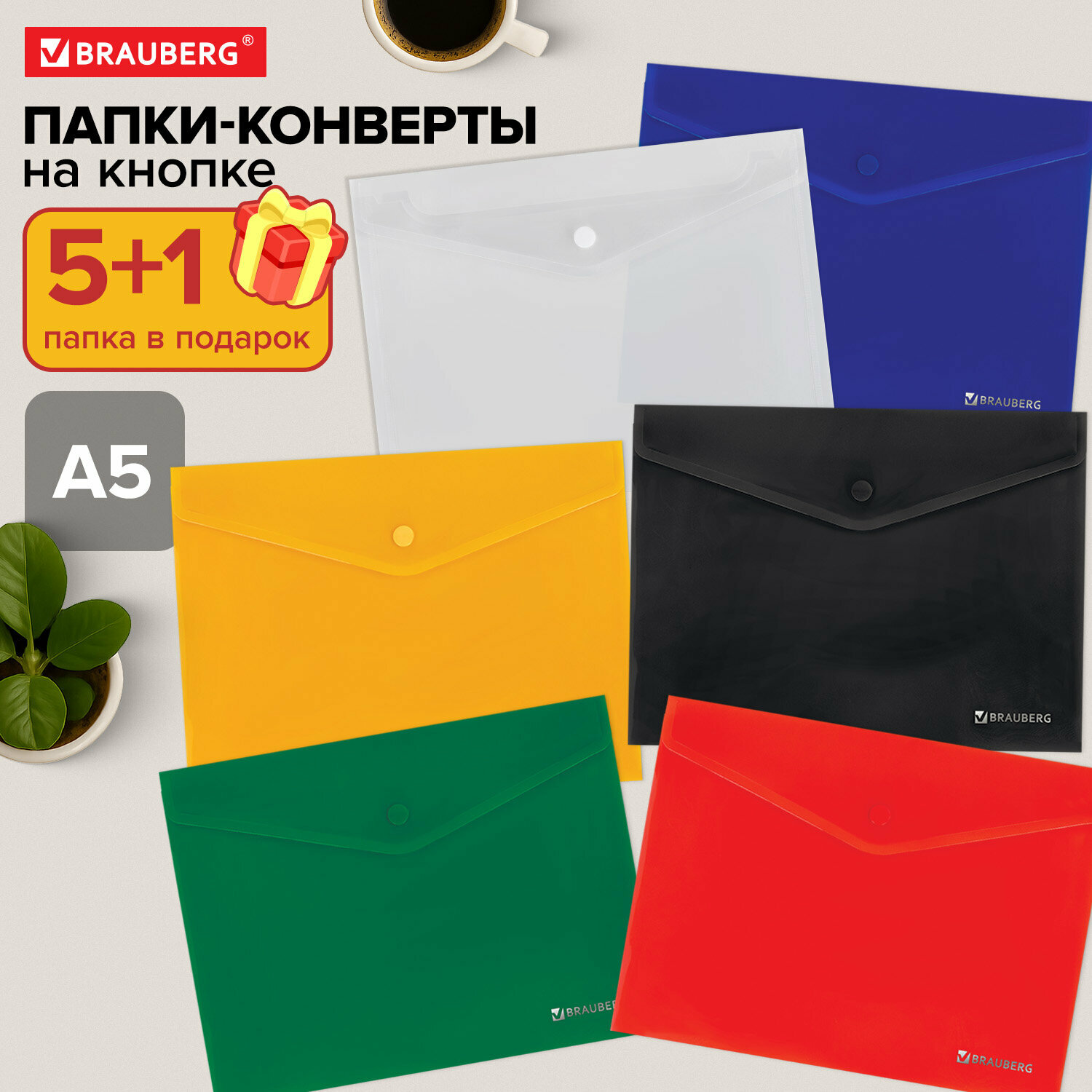 Отзывы на Папка конверт для тетрадей, документов и бумаг А5 с кнопкой, набор 6 штук, канцелярия для школы и офиса, цвета ассорти, Brauberg, 272873