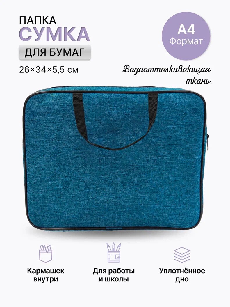 Папка для документов А4 на молнии, сумка с ручками для тетрадей и рисунков, уроков труда ИЗО, ткань оксфорд, аквамарин информация: