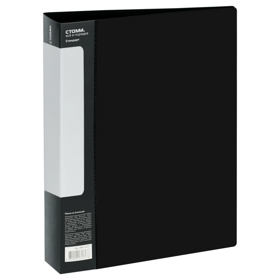 Папка на 4 кольцах СТАММ "Стандарт" А4, 40мм, 700мкм, пластик, черная, 368365 информация: