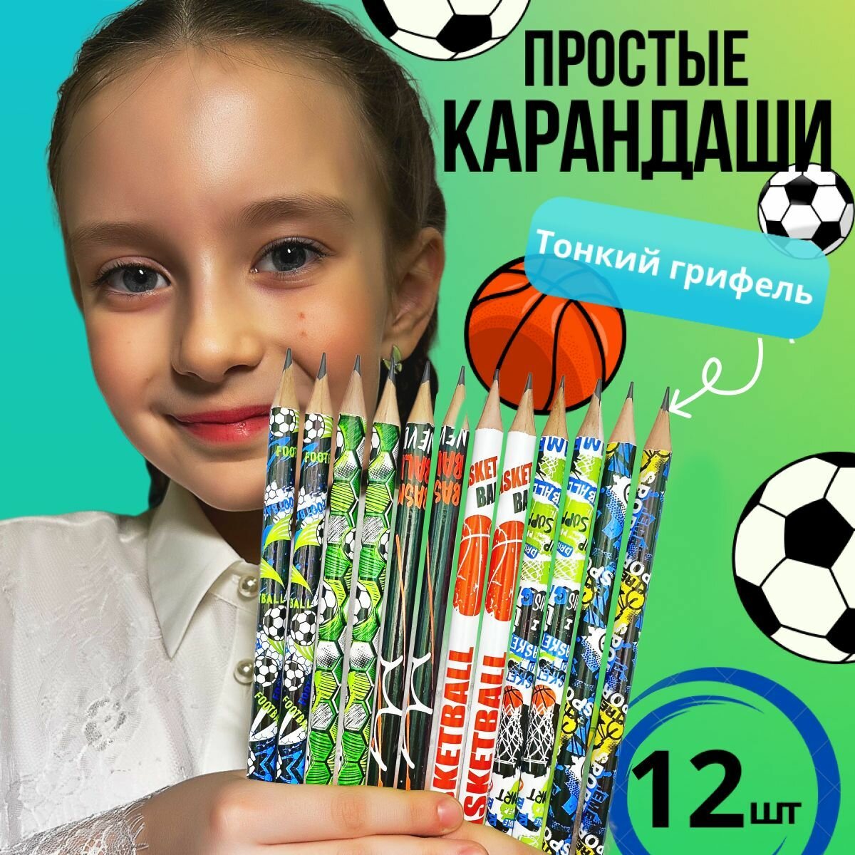 Набор простых карандашей чернографитных с рисунком "Спорт", 12шт информация: