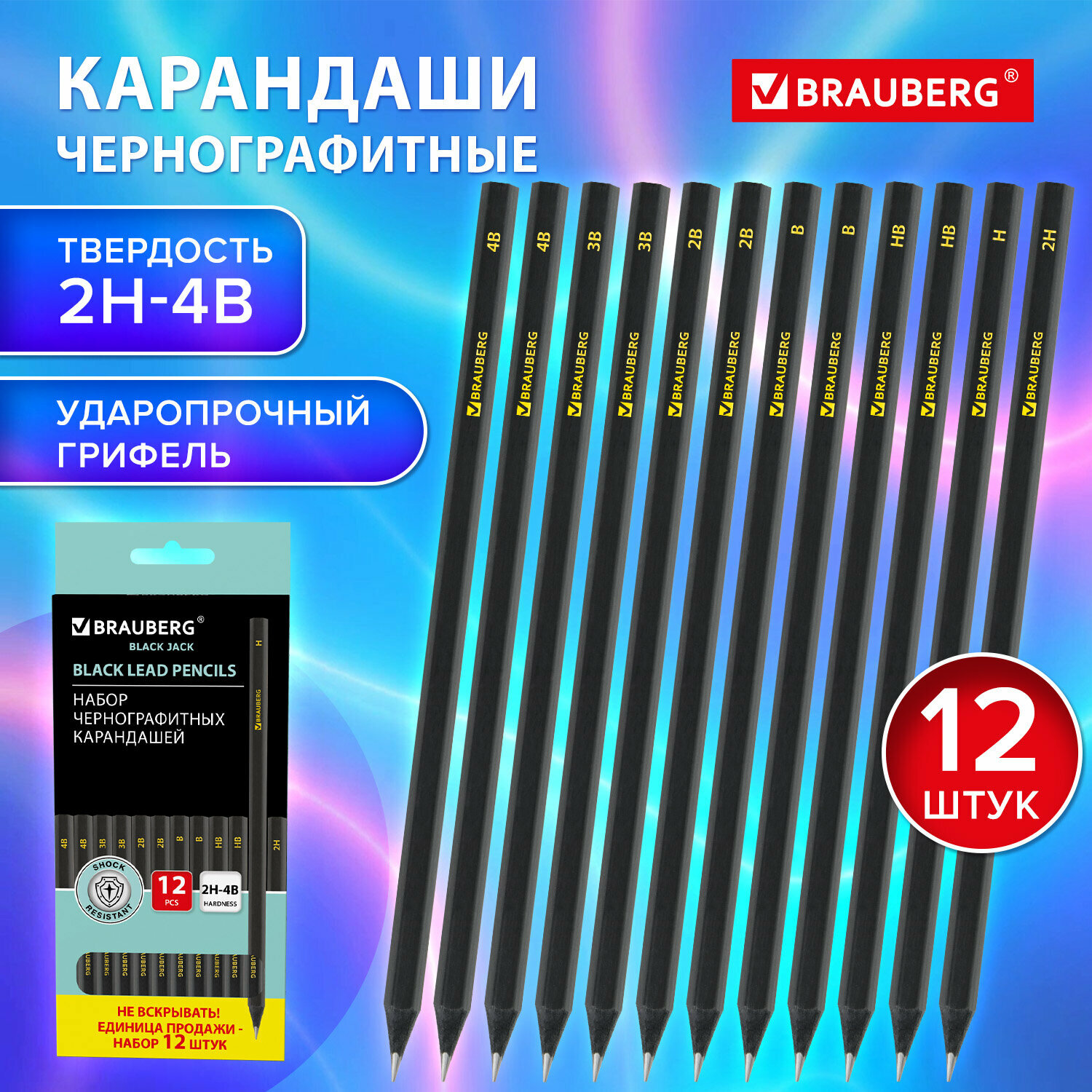 Карандаши простые чернографитные Brauberg Набор 12 шт, Black Jack, 2Н-4В, без резинки / ластика, черные, дерево, заточенные, 180620 информация: