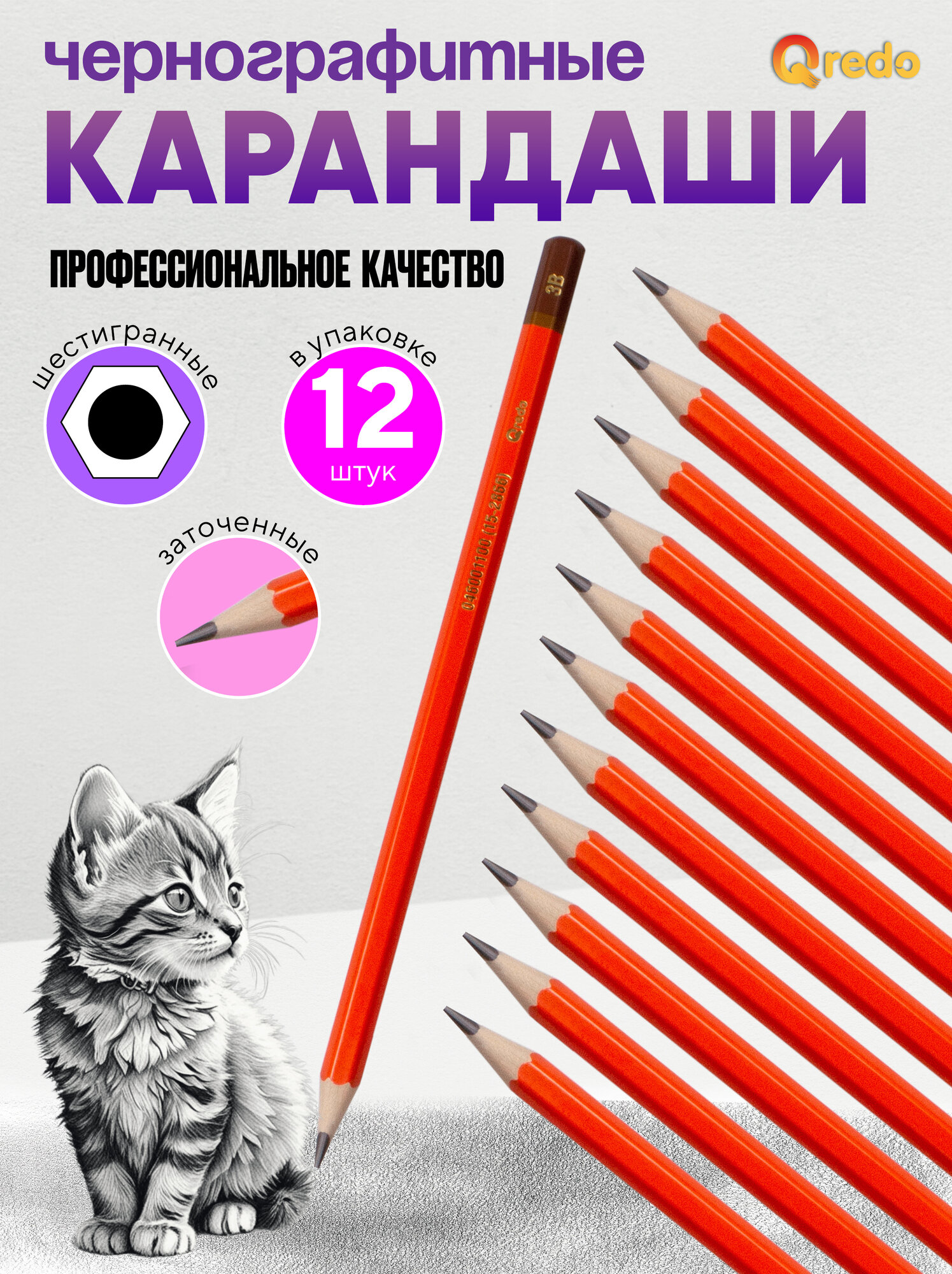 Отзывы на Карандаш шестигранный деревянный 12 видов твердости QREDO без ластика, заточенный, чернографитный, упаковка 12шт