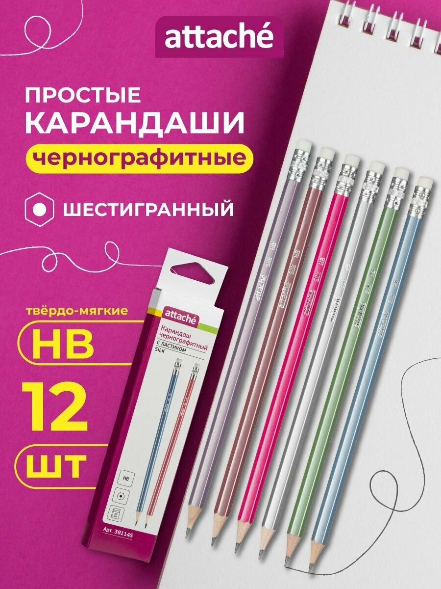 10 цен на Карандаши простые с ластиком Attache, чернографитные, НВ, набор 12 шт