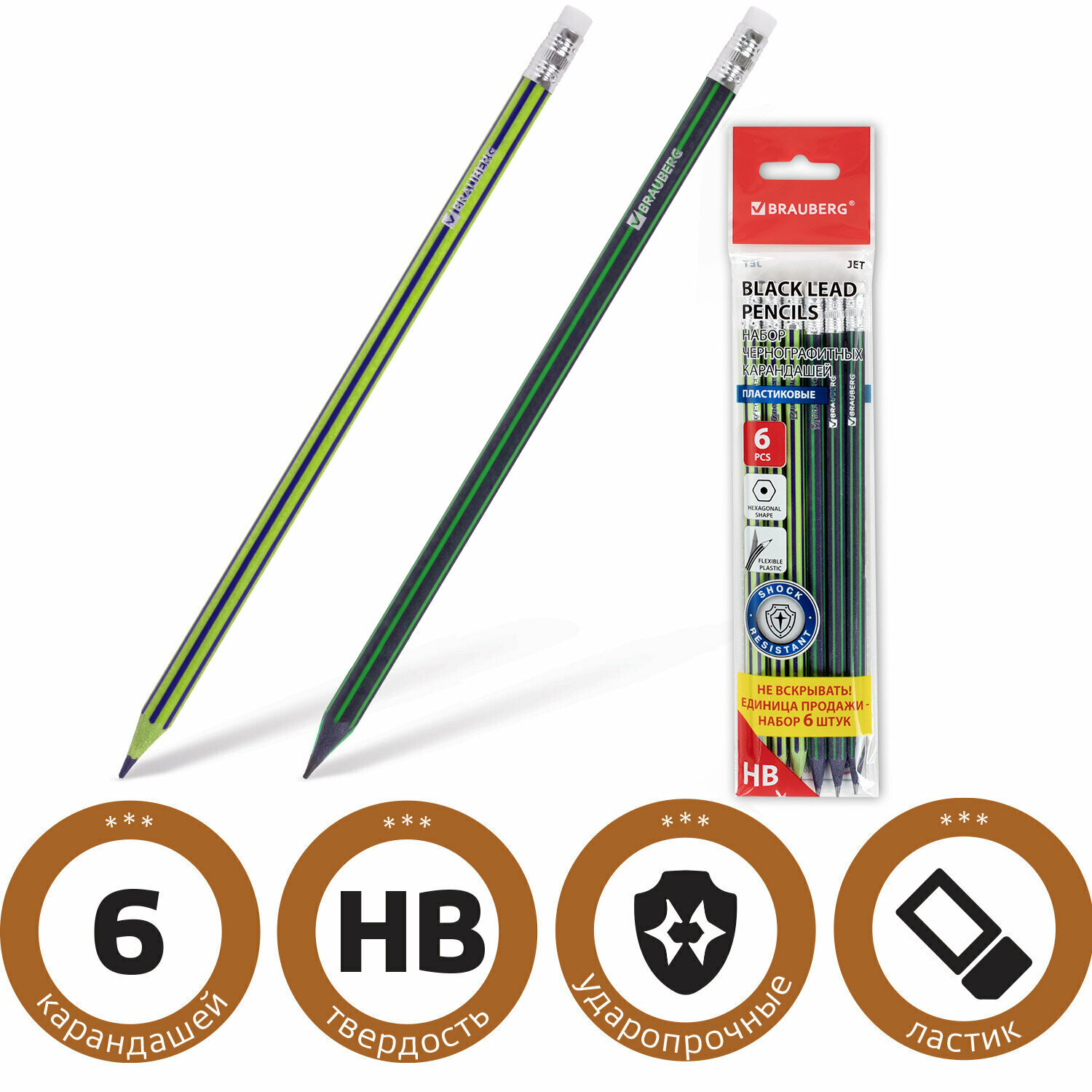 10 цен на Карандаши простые чернографитные Brauberg Набор 6 шт, Jet, Нв, с резинкой, пластиковые, корпус ассорти, заточенные, 180632