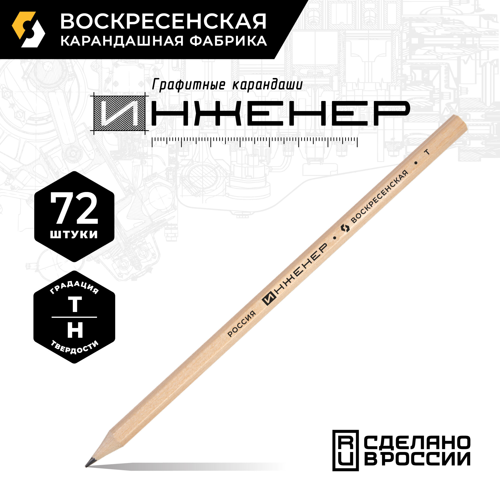 Карандаш ч/г Воскресенская карандашная фабрика "Инженер" 6М (6B), заточен, 72 штуки